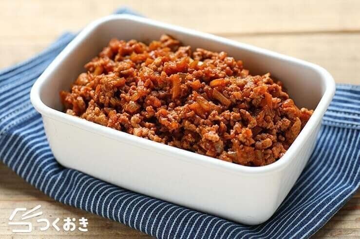 手作りならではの優しい味わいが特徴のミートソースを、ご飯にかけて丼にしました。シンプルかつどこか懐かしい味わいで家族みんなで楽しめます。ゆでたブロッコリーや卵を添えれば、彩りも栄養価もアップ!たくさん作って冷凍保存できるのもうれしいポイントです。