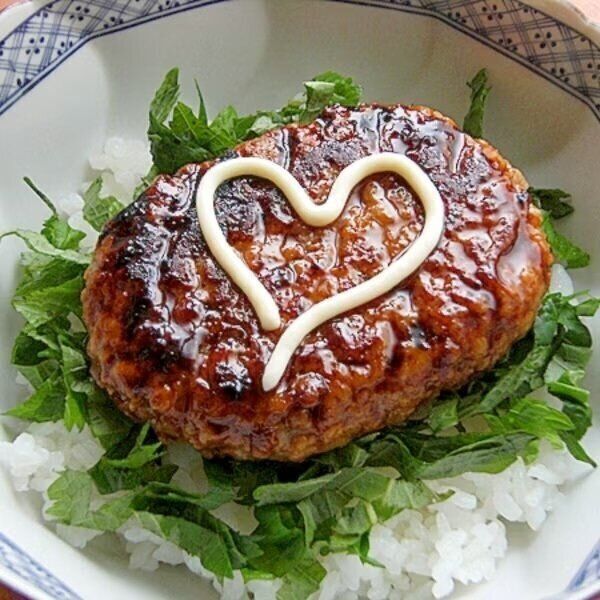 お魚が苦手な子どもでも食べられそうなハンバーグ丼です。オリーブオイルでジューシーさをたし、みんなが大好きな照り焼き味で仕上げました。マヨネーズで描いたハートで、コクもかわいさもプラス!大葉の緑色とのコントラストもきれいです。
