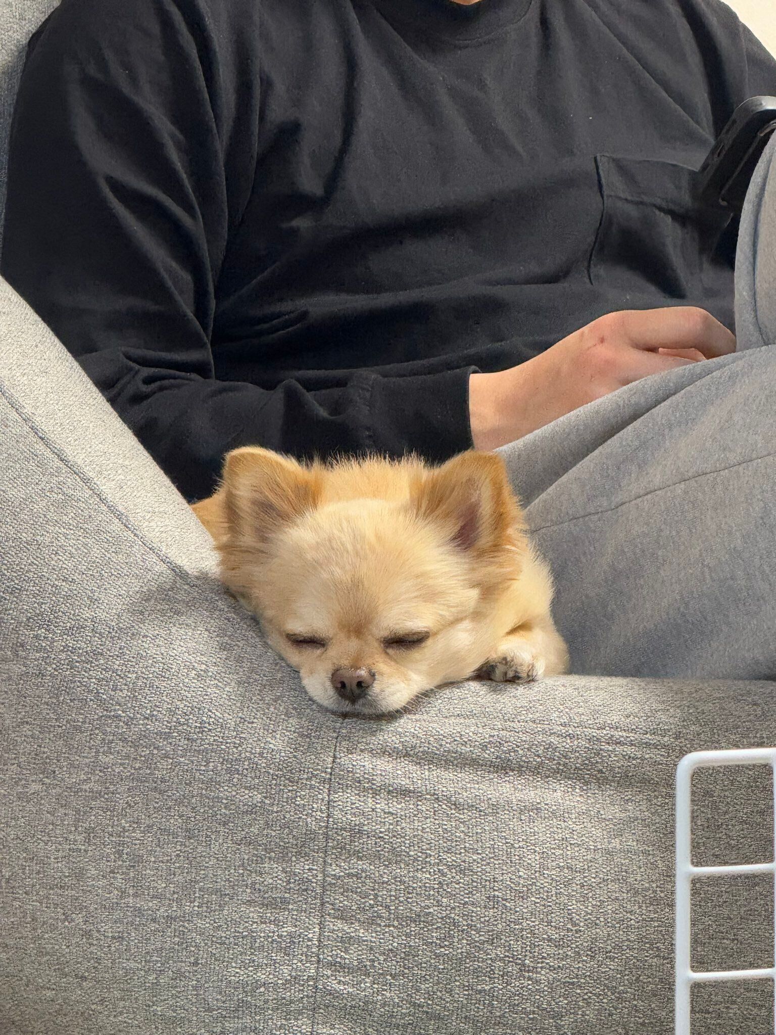飼い主さんのそばでリラックスしきっている様子が、かわいすぎますね。