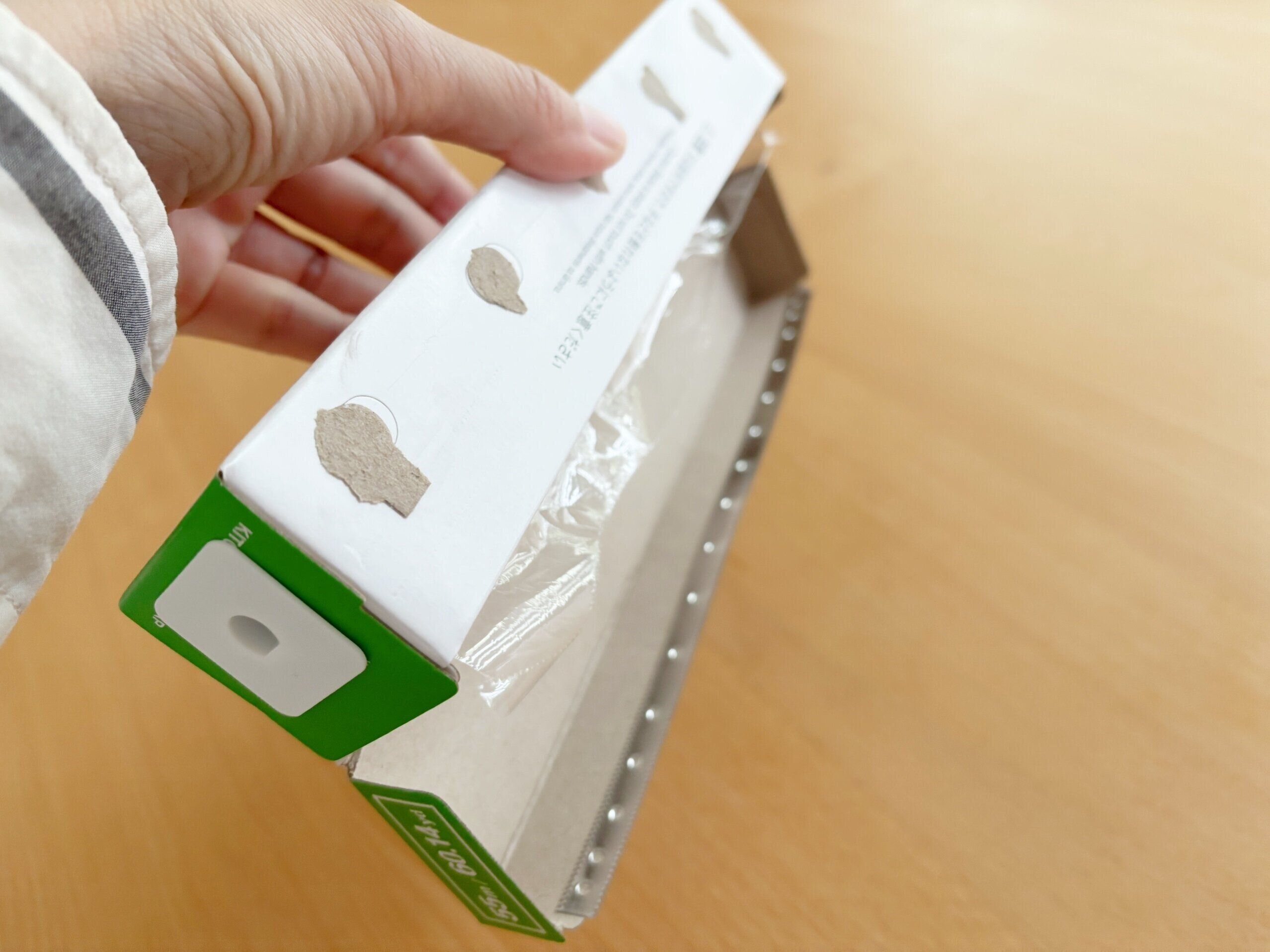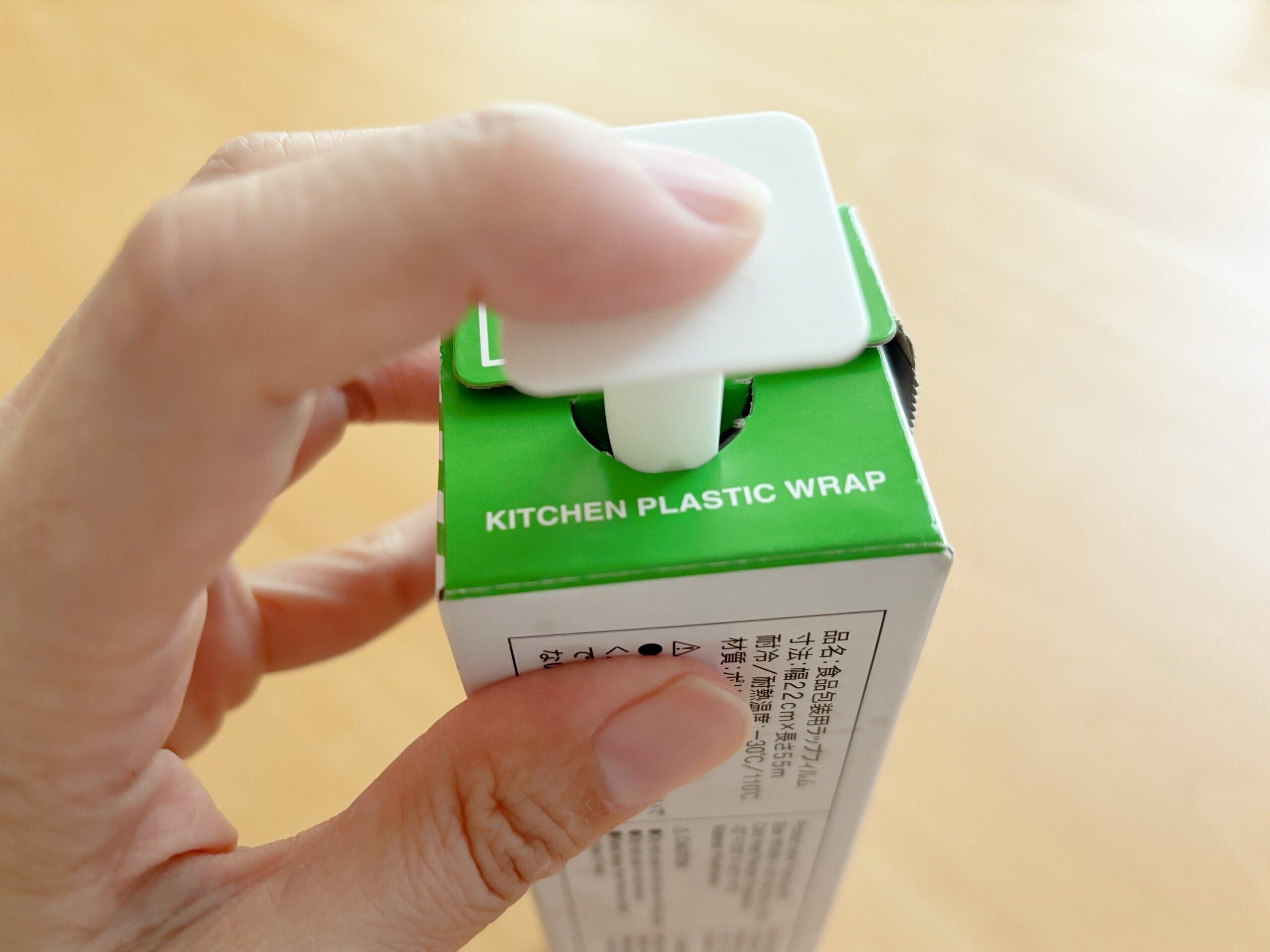 最近のラップは100均で購入したものでもサイドをプッシュして中の紙管が飛び出さないようにする工夫はされているのですが、これだと強く引っ張ると出てきちゃうことも多いんですよね。そのサイドのプッシュ穴にこのストッパーを差し込むと中の紙管がしっかりと固定されて箱から飛び出るを防止してくれるストッパーなんです。