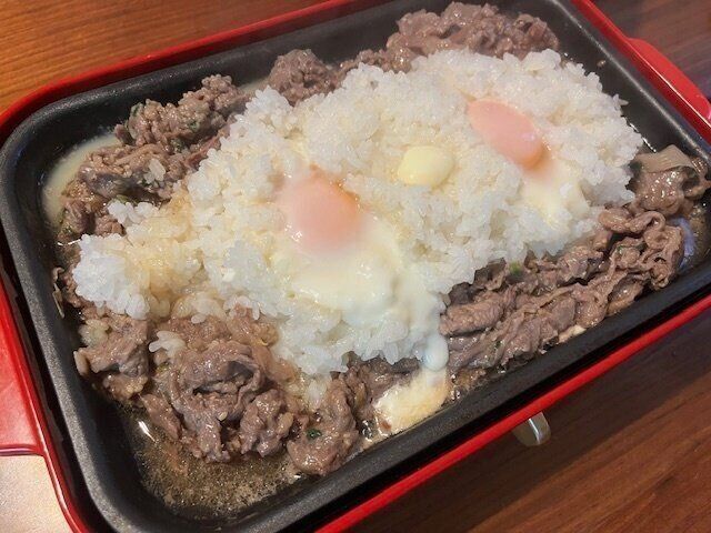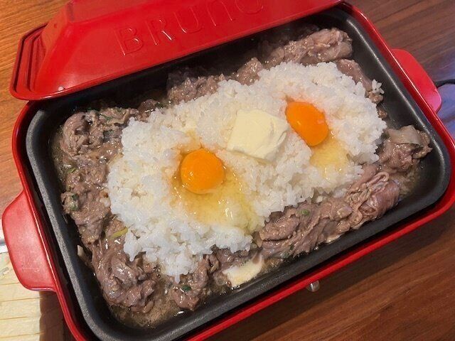 半熟の卵と溶けたバターが美味しい!ホットプレートの上で混ぜても、取り分けてから混ぜてもOK!