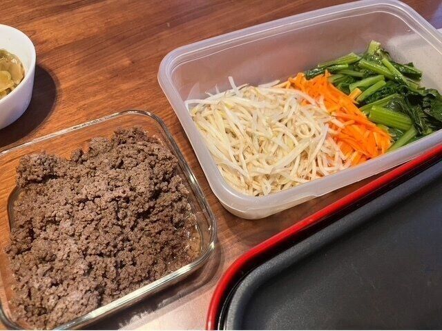 まず、ビビンバの具材を用意します。肉そぼろ、ナムルを作りました。