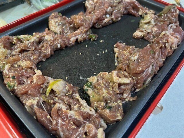 まずはこちら。ホットプレートの周りで味付け肉を焼きます。今回はこどもたちも大好きなプルコギビーフを焼きました。