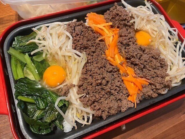 おもてなし感満載のホットプレートビビンバの完成!これはフタを開けた瞬間みんな大喜びです。