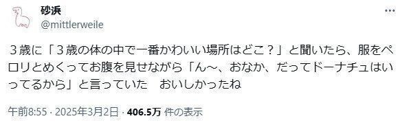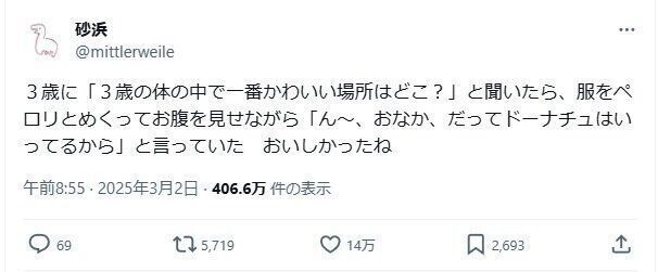 あるとき、3歳の娘さんに「体の中で一番かわいい場所はどこ?」と尋ねた砂浜さん(@mittlerweile)。「ん〜、おなか」と答えた娘さんでしたが、その理由が「かわいすぎる」と14万件以上のいいねを集めました。お話をうかがいます。