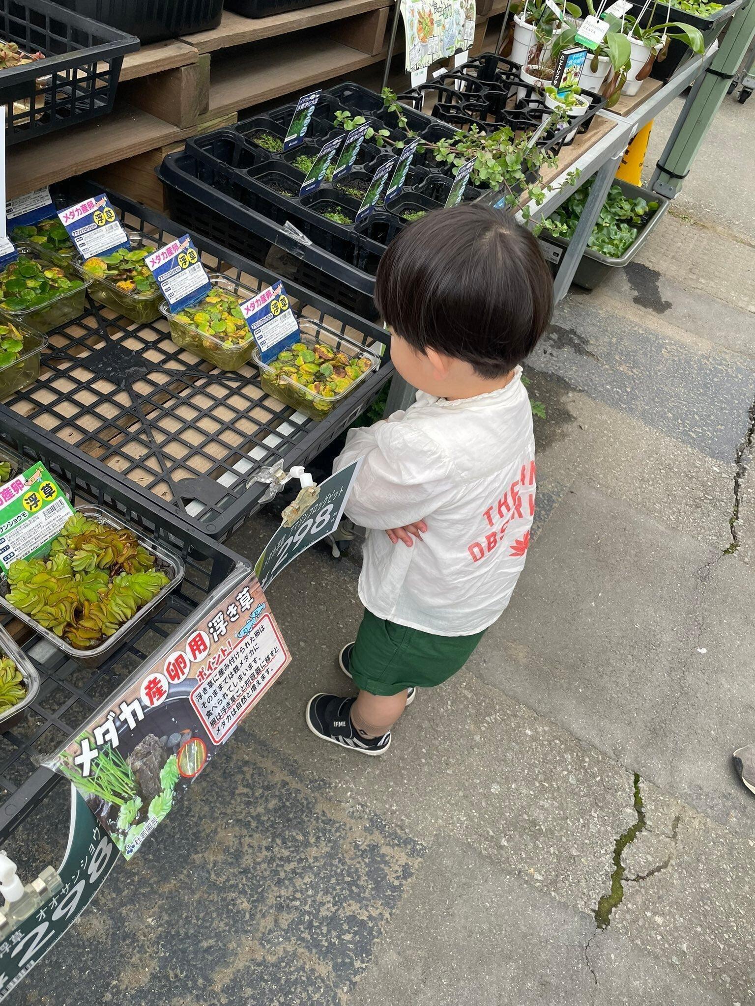 「自宅で飼い始めたメダカの、水槽に入れる水草を探しているところでした。これまでホームセンターに行く機会があまりなかったため、息子は陳列されている草や花を物珍しそうに見ていました」