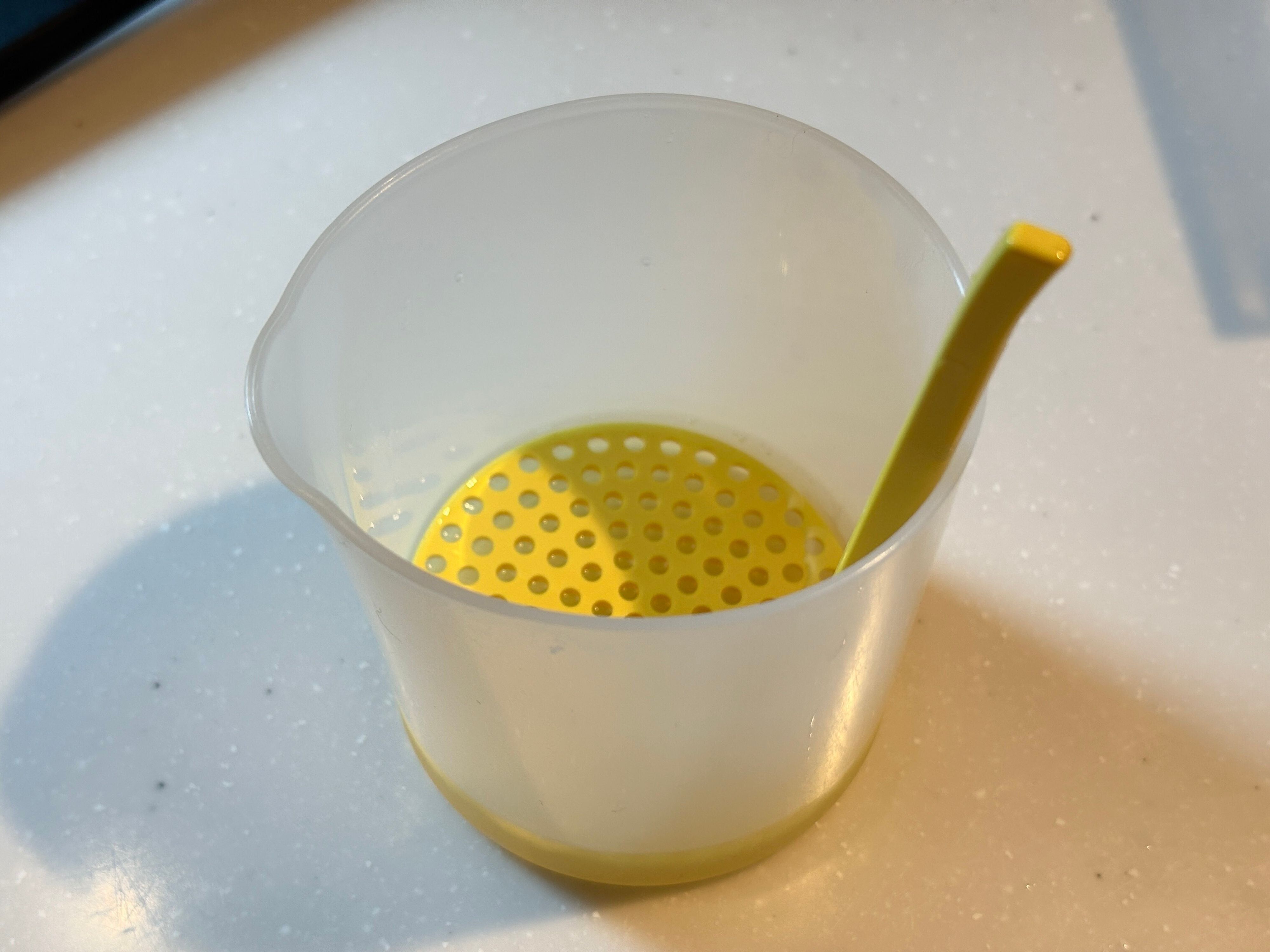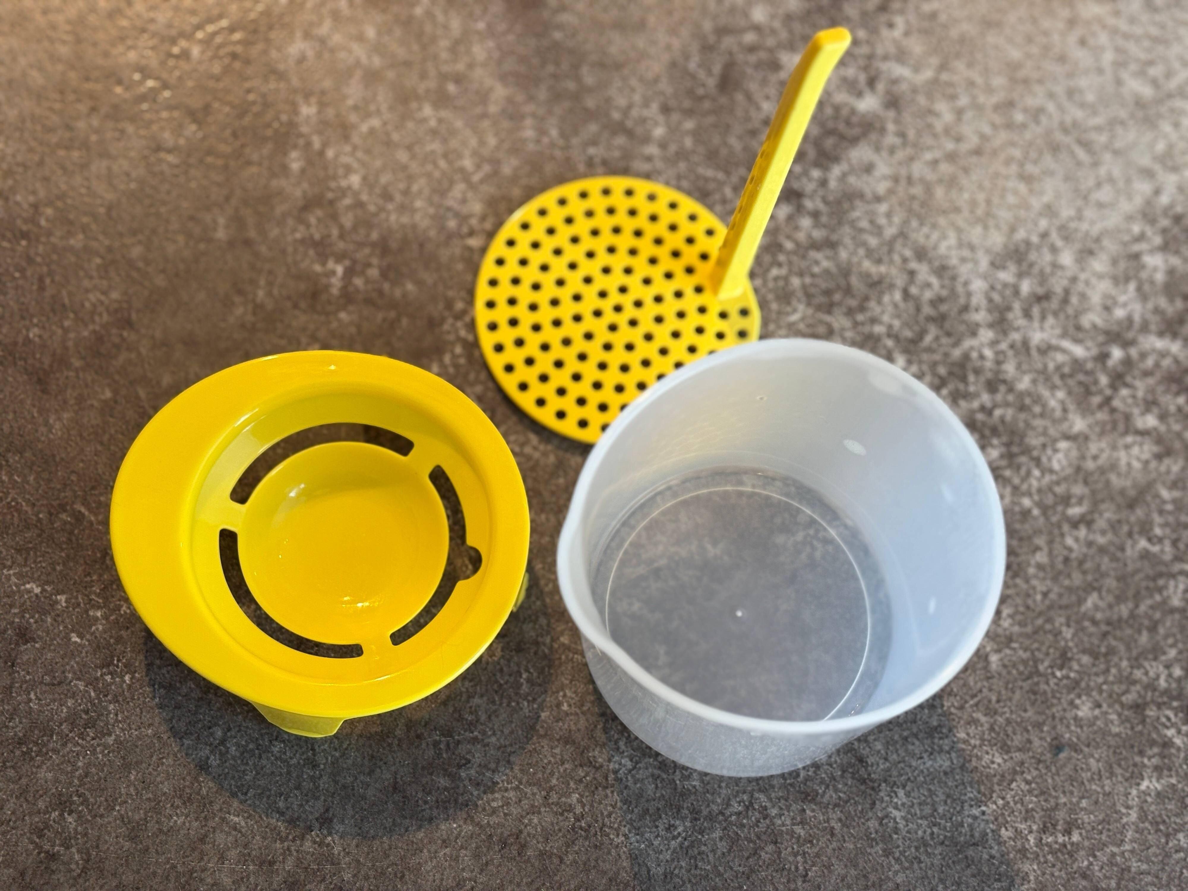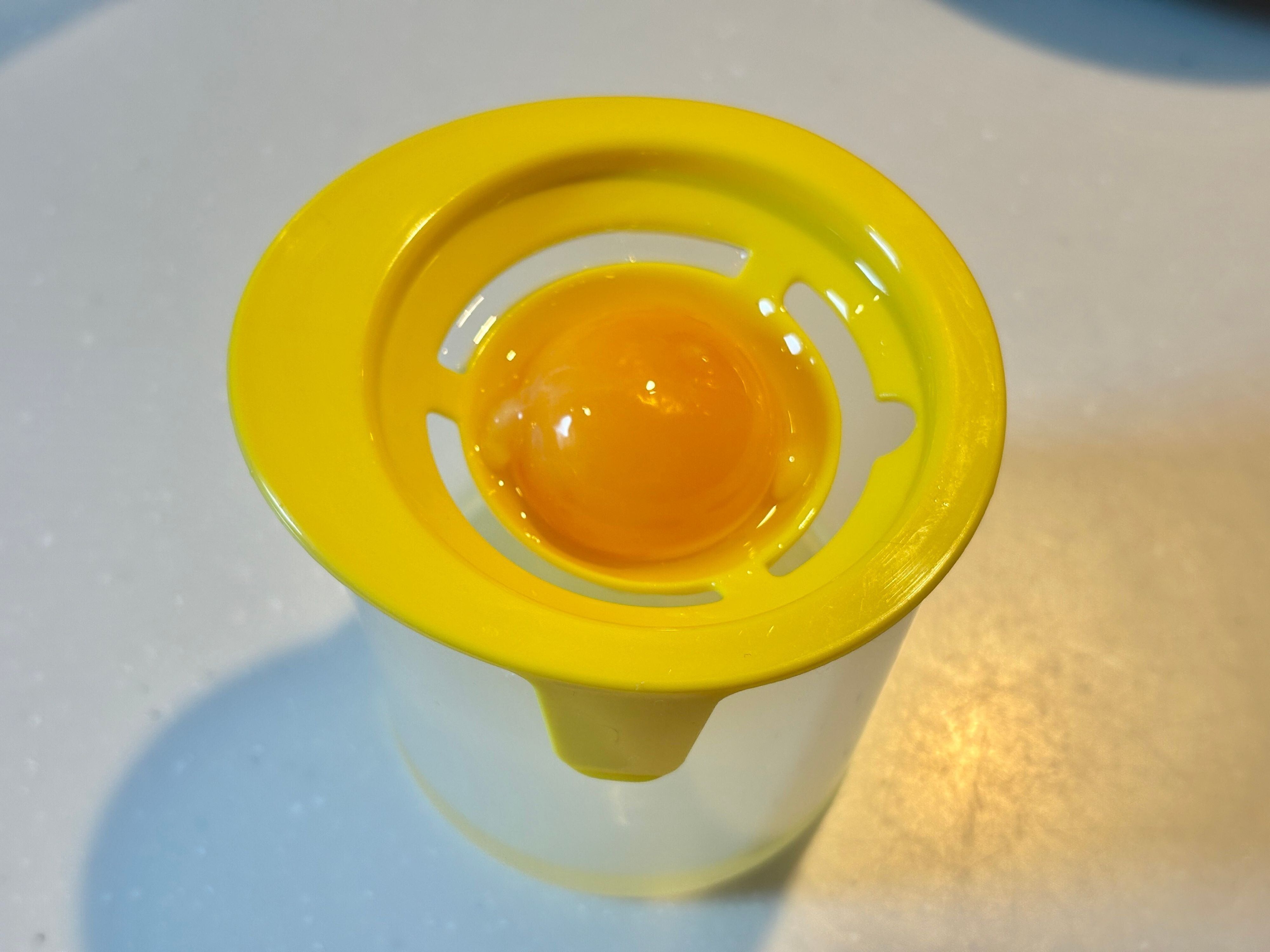 使い方はとても簡単。まず、メレンゲカップに黄身分けをセットします。黄身分けのくぼみに卵を割り入れるだけで、簡単に卵を黄身と白身に分けることができました。これだけでもかなり便利ですよね。