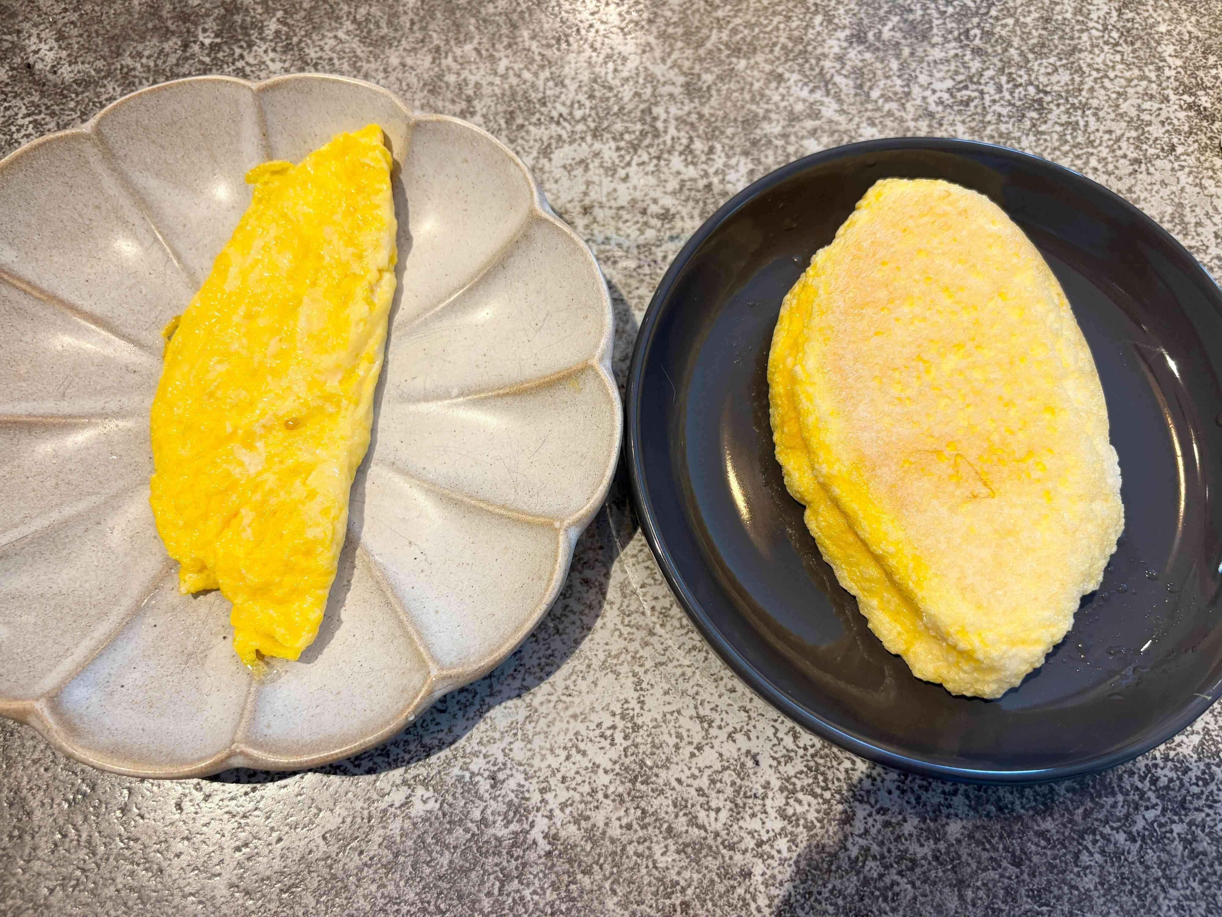 簡単にメレンゲが作れることはわかったけれど、いつものオムレツとどれくらい仕上がりに違いがでるのか気になりますよね。そこで、通常通りに作ったオムレツと「ふわふわエッグメーカー」を使って作ったオムレツを比較してみました。どちらも、卵1個を使用しました。