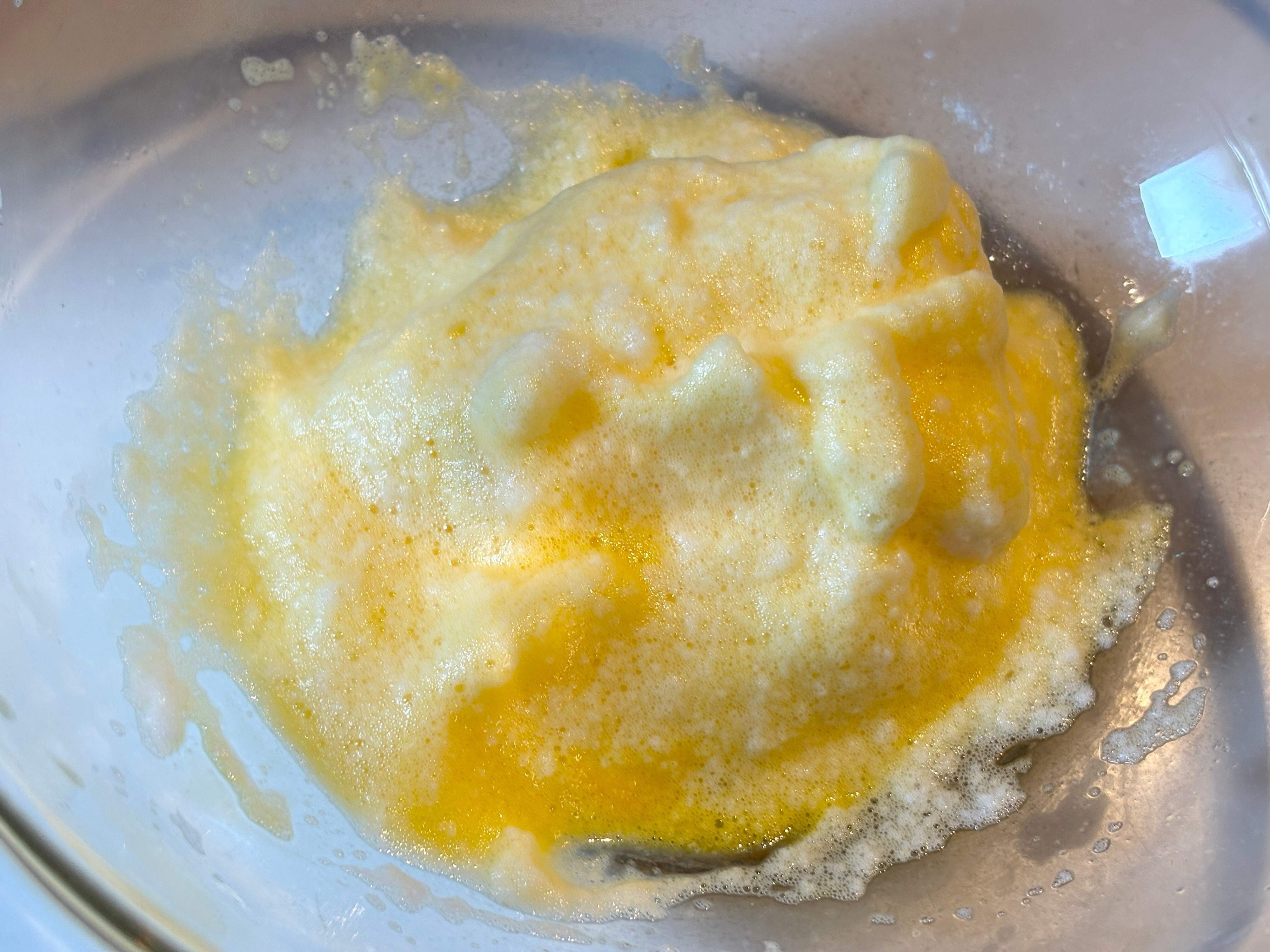 卵を黄身と白身に分け、黄身をボウルに移して溶いておきます。そこへメレンゲを入れ、つぶさないようにふんわりと混ぜます。