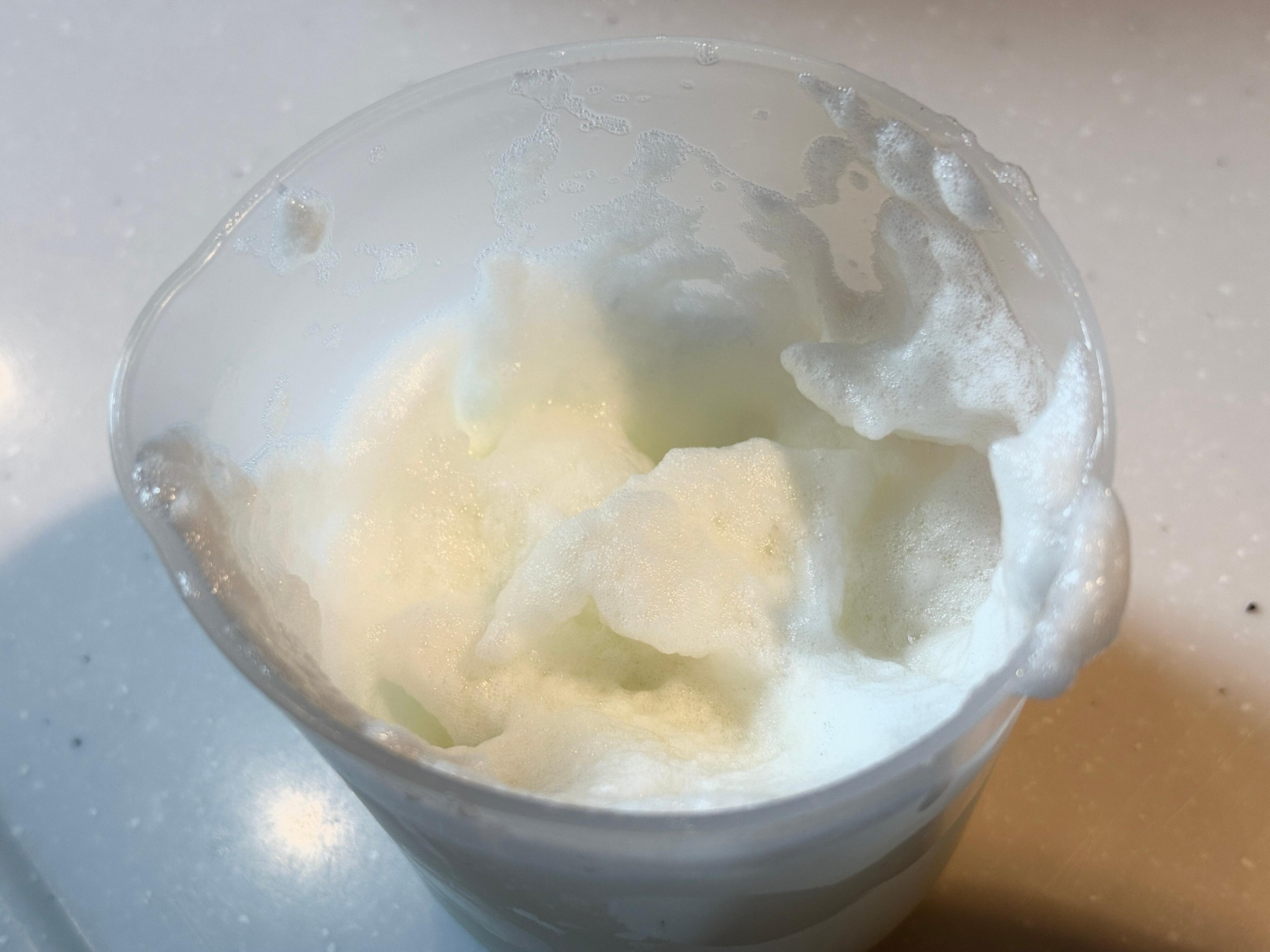 ツノが立ったきめ細かいメレンゲが、たった1分半で作れました。パーツが3つだけのシンプルな構造なので、洗い物がラクなのもうれしいポイントです。