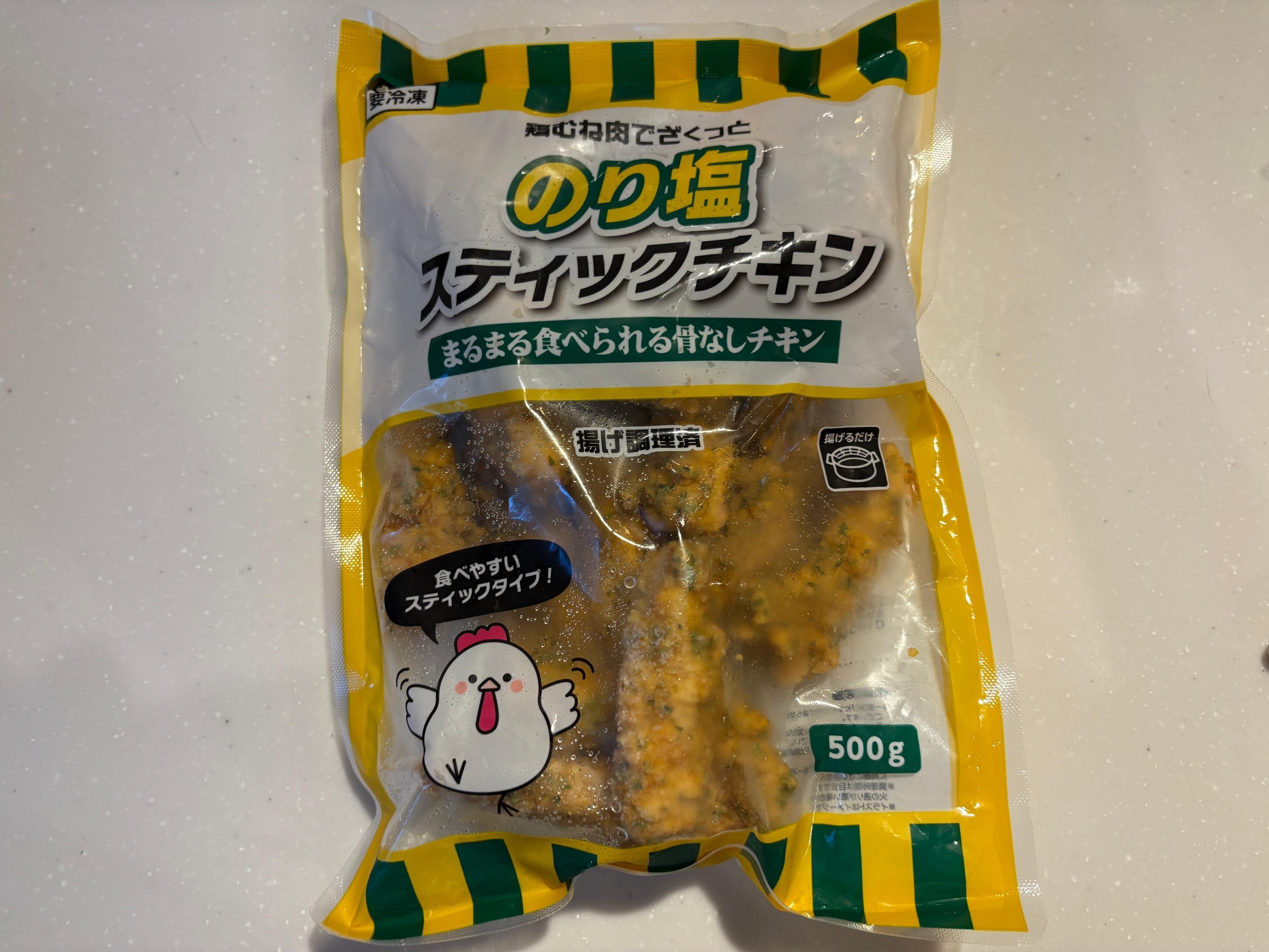 ザクザクした食感が特徴の「のり塩スティックチキン 518円(税込)」。1袋500g入りで、個体差はありますが今回購入したものには22本入っていました。