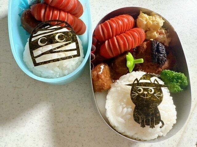 子ども用のお弁当のおにぎりにぴったりと貼り付けられて、一気にハロウィン仕様に。