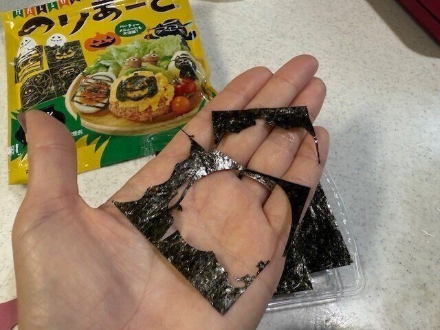 おにぎりやゆで卵など好きな食材にペタッと貼れるシート状の海苔で、しかも最初からハロウィンの型にカットされているんですよ。