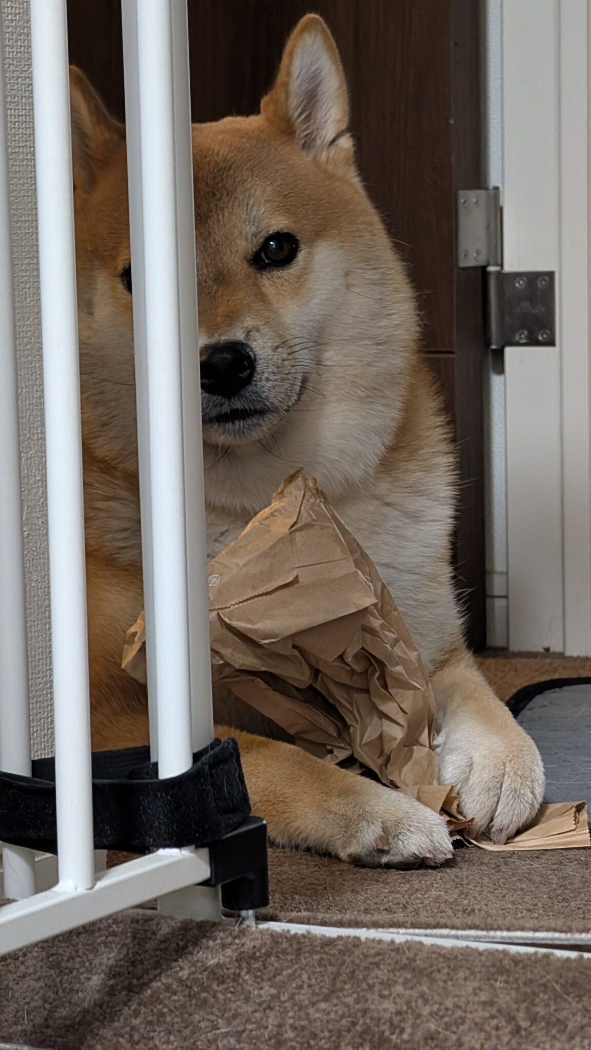 太郎が私たちに見える場所で不満そうにハンバーガーの袋を抱きしめていたので、思わず撮影してしまいました。片づけ忘れた空の袋がテーブルの上にあったのでしょうね。