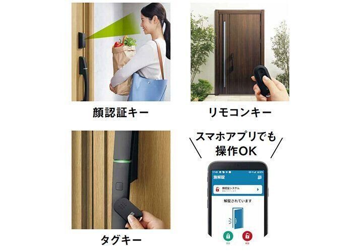 顔認証キーなら両手がふさがっていても、施解錠が可能。リモコンキー・タグキー・スマホアプリなども選べます。