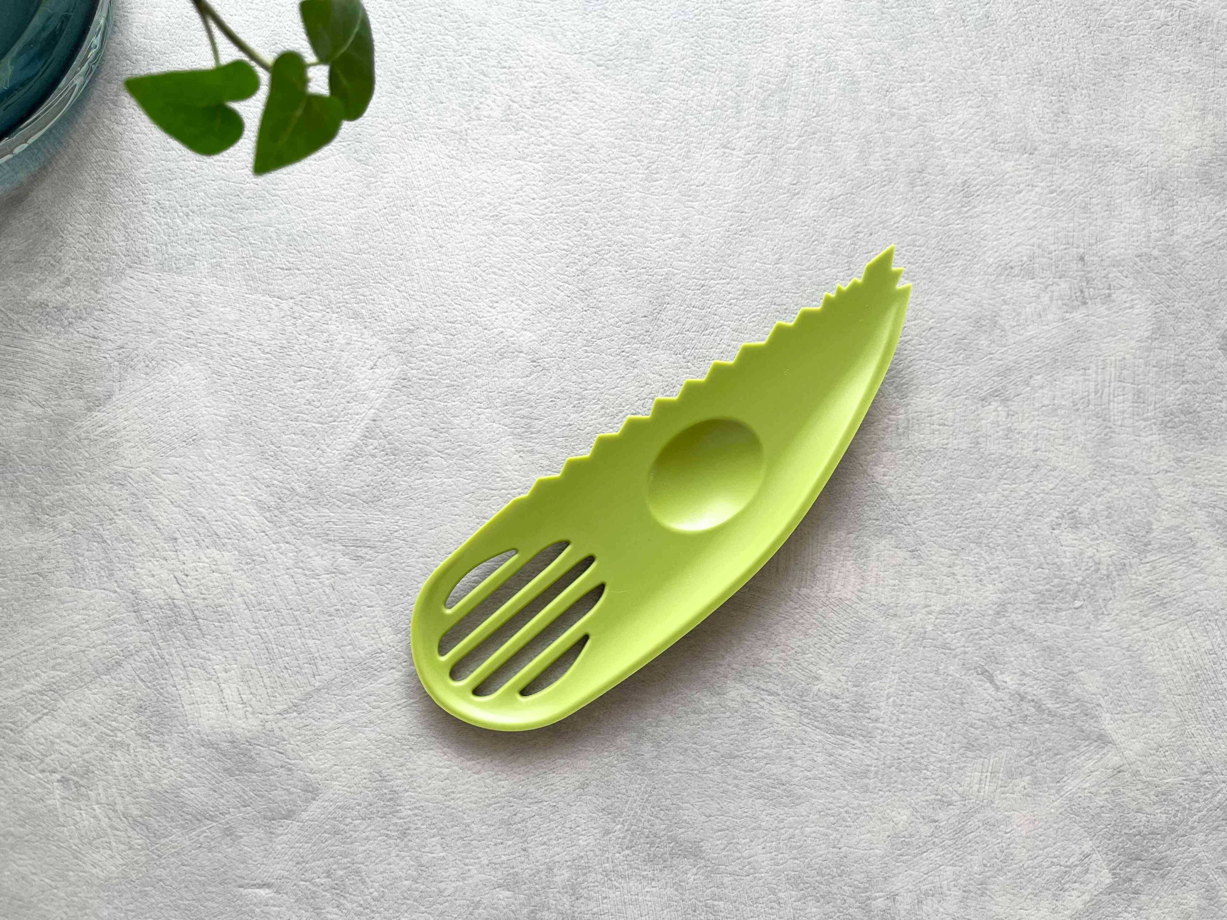 先端が尖っていて側面がギザギザしていたり、真ん中が少し窪んでいたり、穴が空いている部分があったりと、形はしゃもじやスプーンのようにも見えるけど、あまり見なれないデザインをしているのが特徴です。それぞれのパーツを使うことで、皮を切る・種を取る・果肉をすくう・マッシュするという4つの工程を、これ1本で行うことができるんですよ。