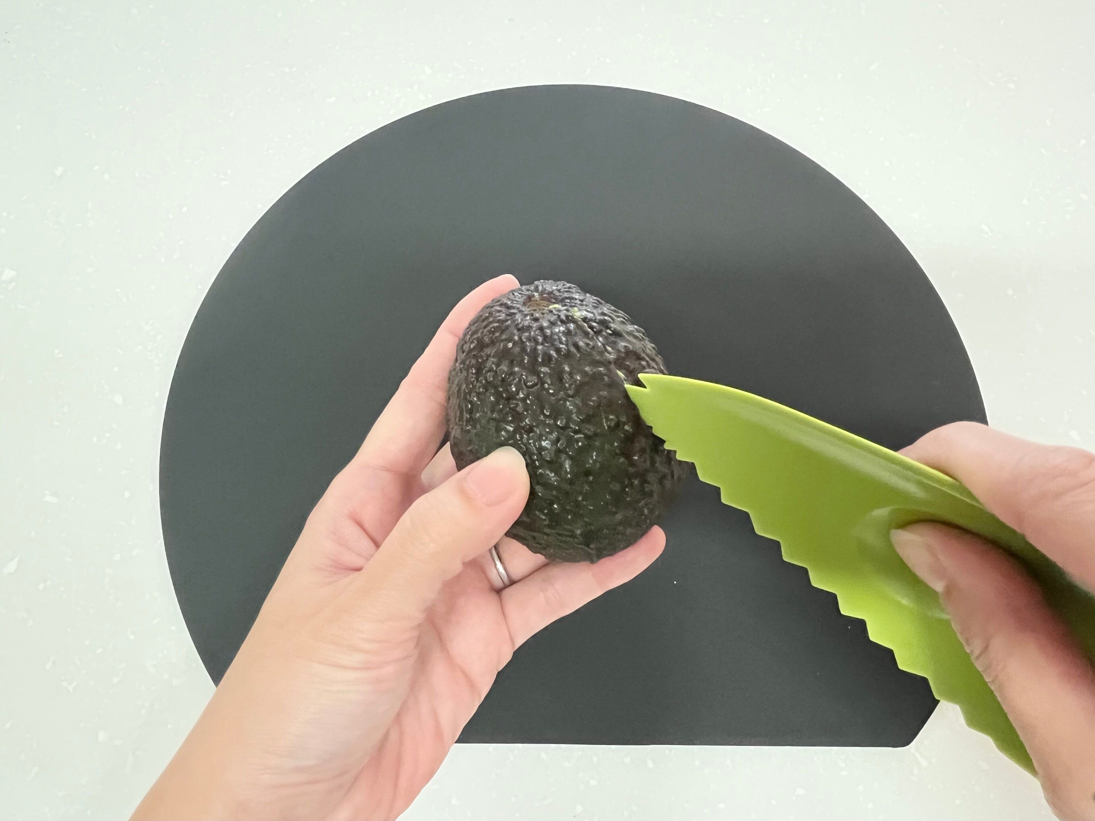 では、アボカドの下処理をしてみます。まず、側面のギザギザの部分を使って、皮を切ります。アボカドの皮は少し硬いので切りにくいですが、包丁を使わなくてもキレイに切ることができます。中央にある窪みに親指を置くと、手に力が入れやすくなり、皮が切りやすくなりますよ。