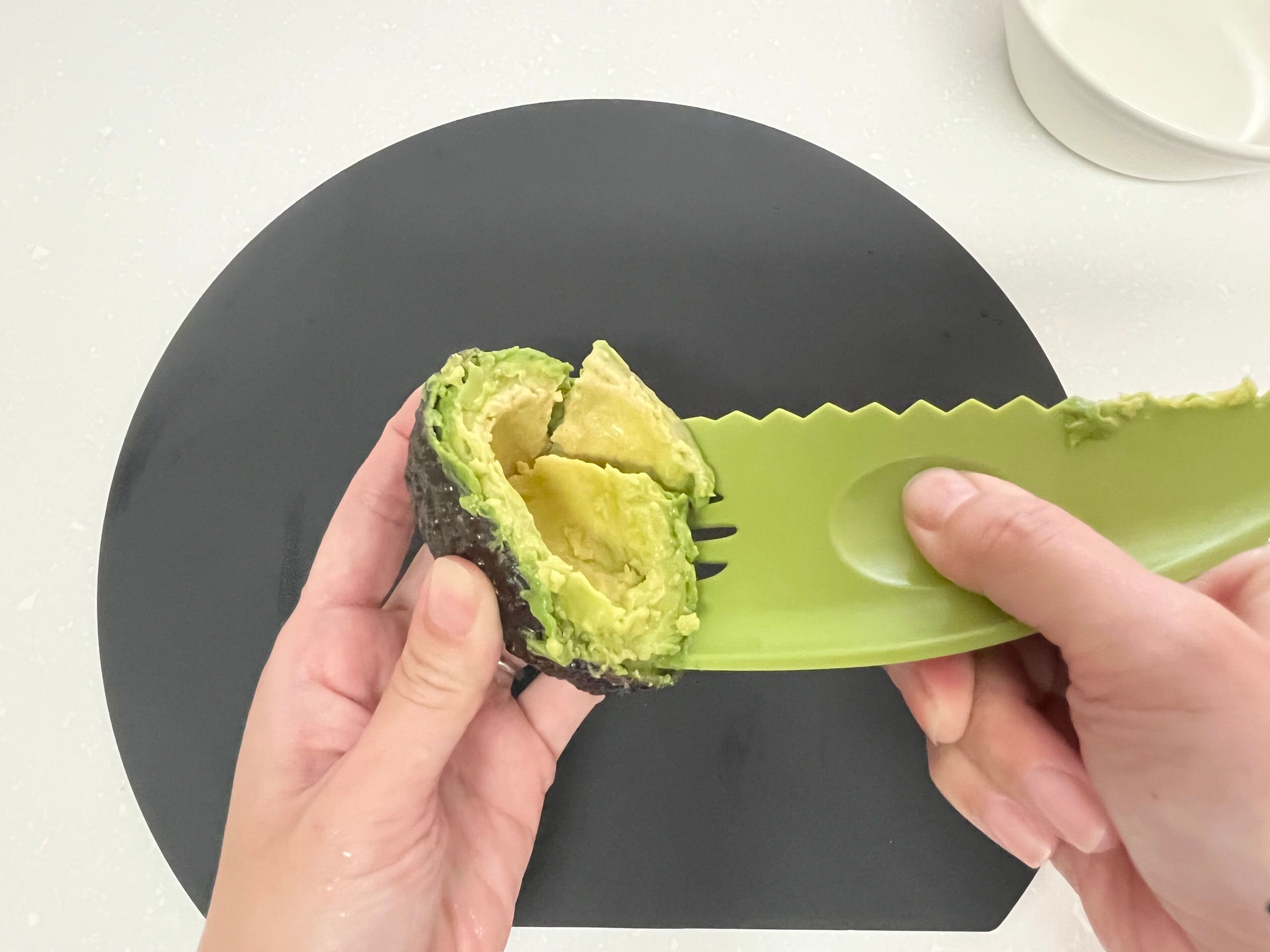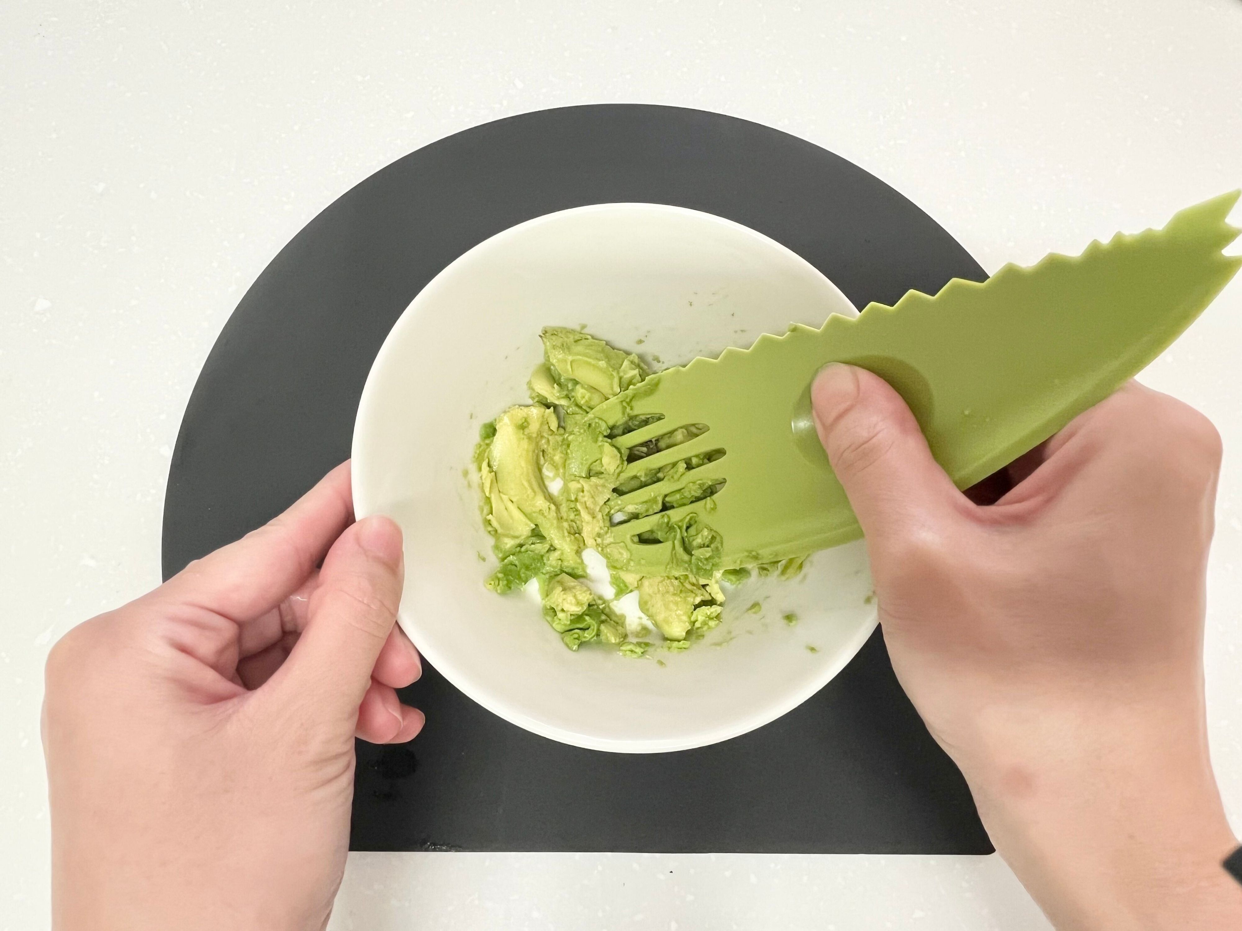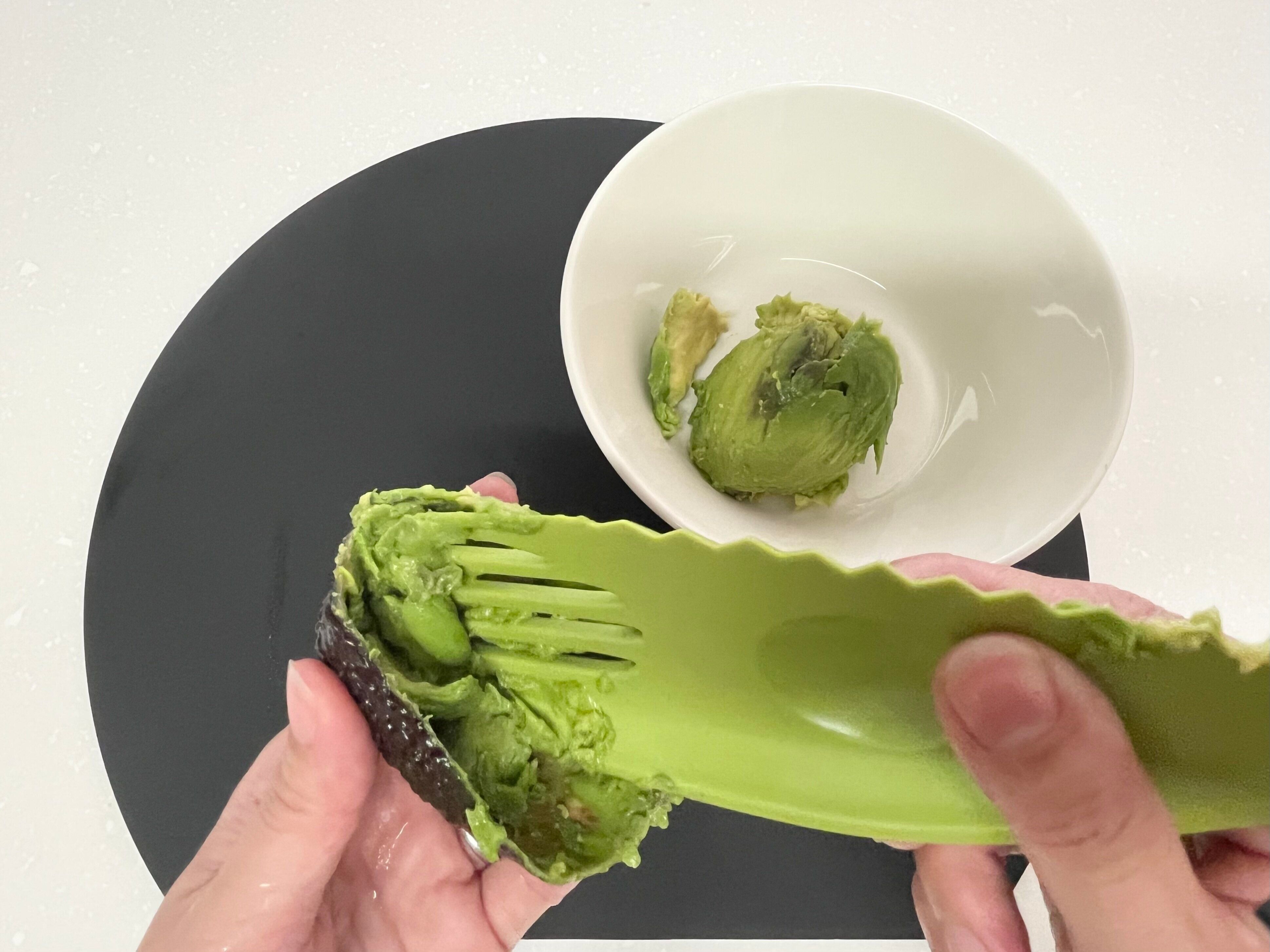 最後は、穴の空いた部分で、果肉をマッシュします。ディップソースをつくるとき、本来なら包丁とスプーンとマッシャーなどを用意しないといけないませんが、これ1本あればつくれるようになります。作業工程に合わせていろんな調理器具を持ち変える必要がなくなるし、洗い物を減らすことができるのもうれしいですよね。