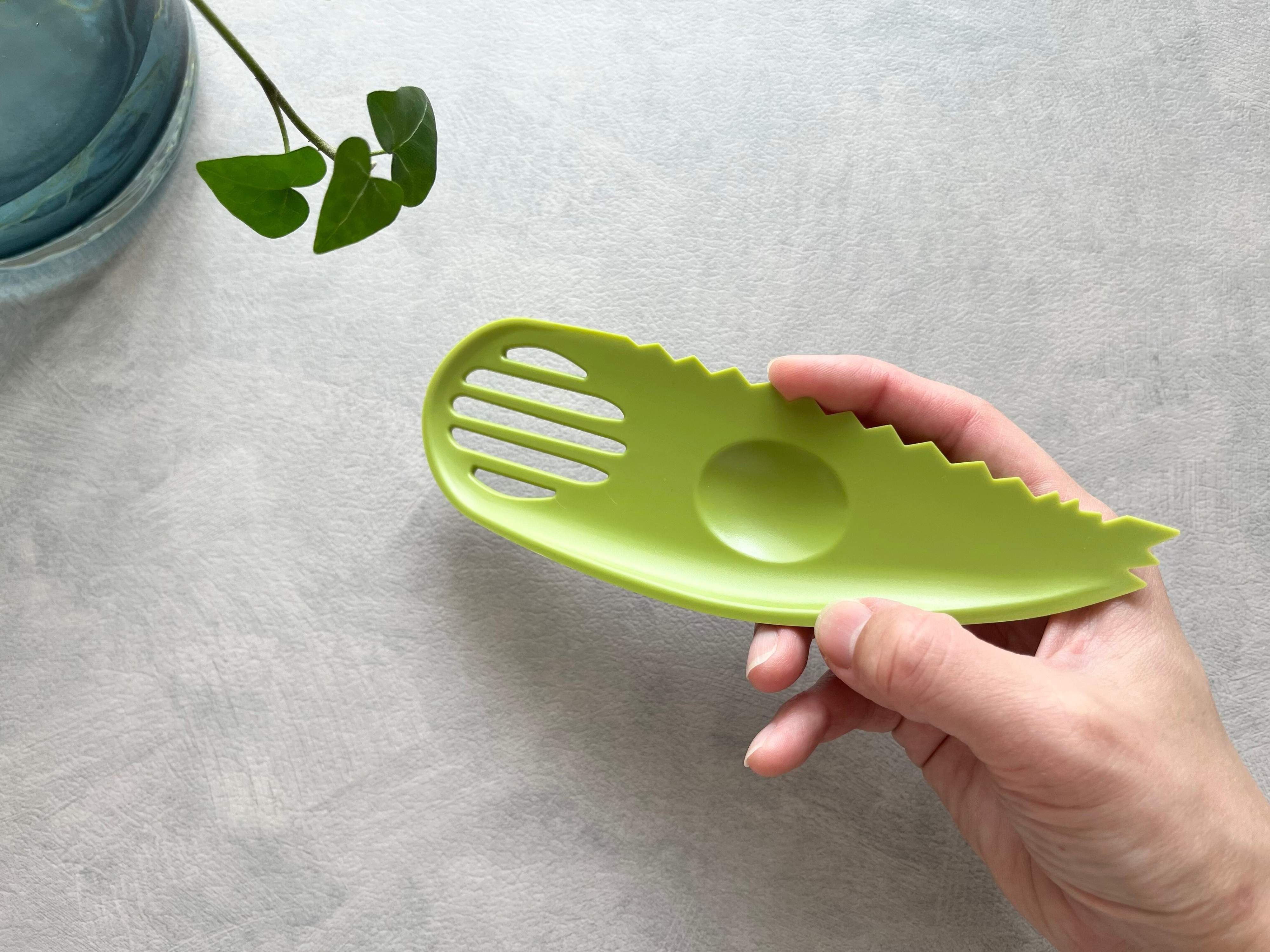 商品のサイズは約5.7cm×1.3cm×17.4cm。適度にカーブしているから手にフィットしやすく、持ちやすい大きさ。そしていかにもアボカド専用といった感じで、アボカドをイメージしたグリーン色をしています。