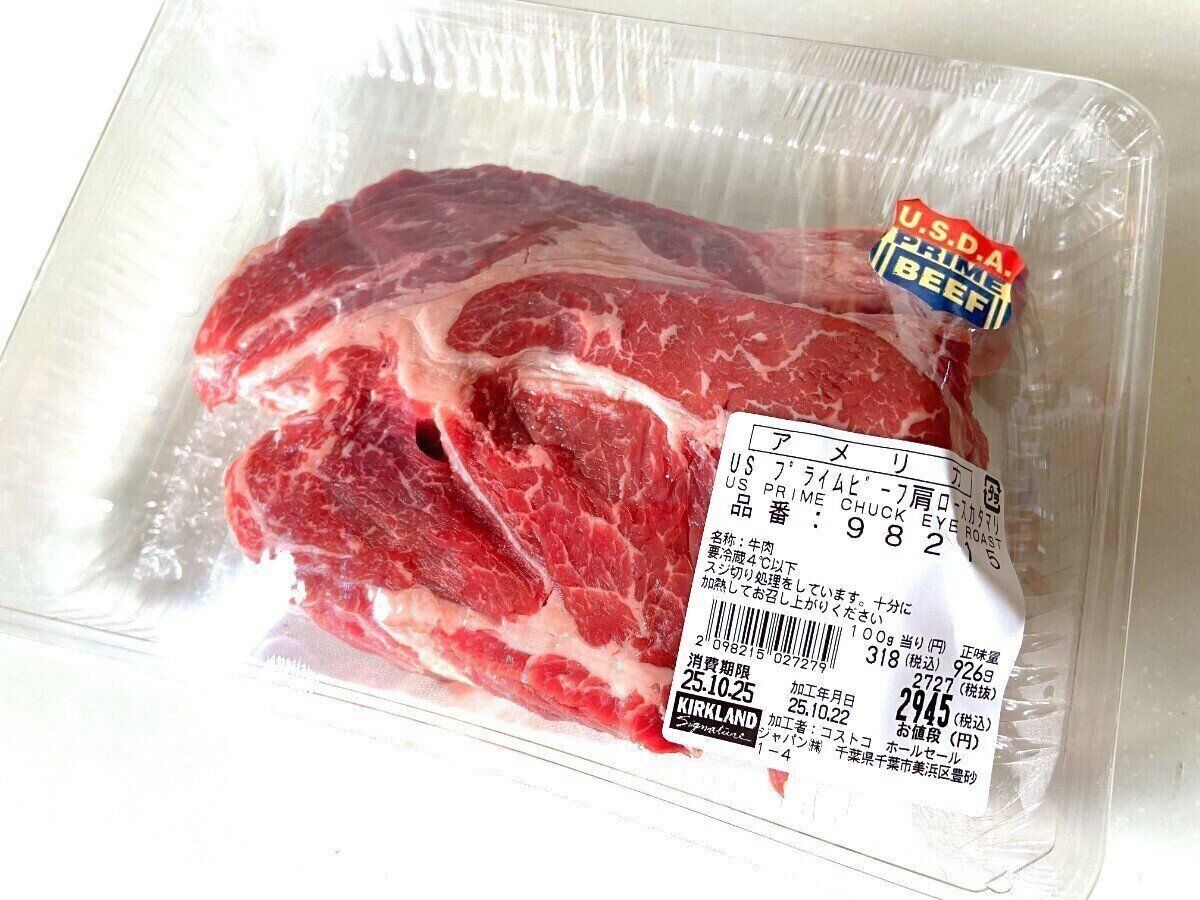 今回紹介するのは、「USプライムビーフ肩ロースかたまり」(購入時:2,945円)です。3,000円近いので一見高い…!?と感じてしまうかたもいるかもしれません。しかしこのお肉、100g当り318円はとってもお買い得なんです。