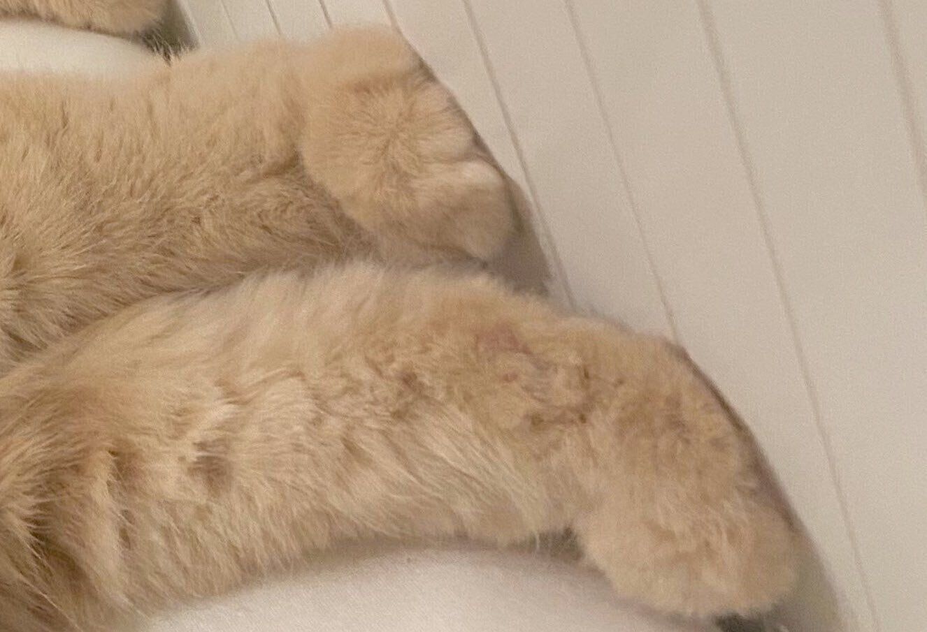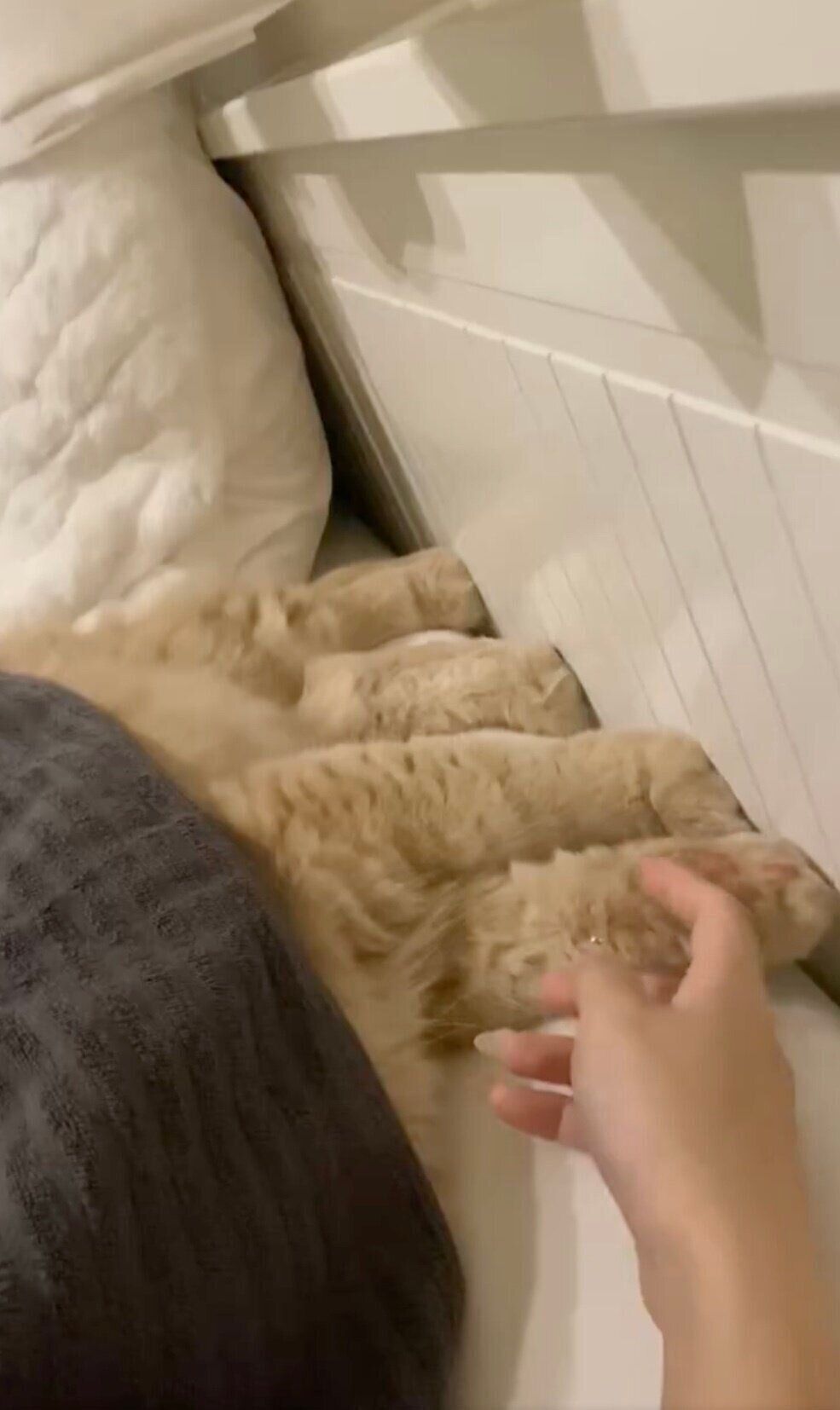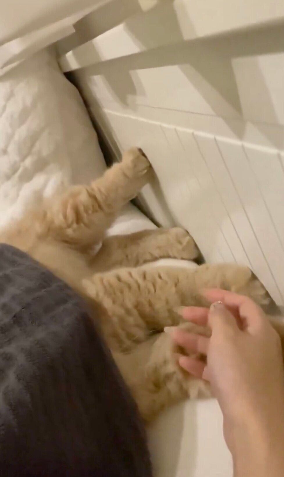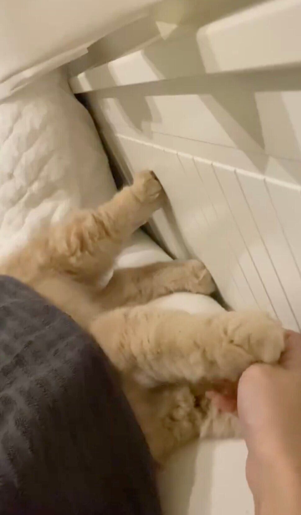 飼い主さんの指に気づいたつきみくんは、モゾモゾと動き、前足で指をつかまえました!