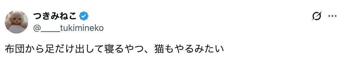 つきみねこさん(@____tukimineko)の投稿が話題になっています。投稿したのは、愛猫つきみくんと一緒に寝ていたときのこと。布団から足だけ出すつきみくんに3.9万いいねと「頭隠して、足隠さず」「かわいい」といった声が集まりました。