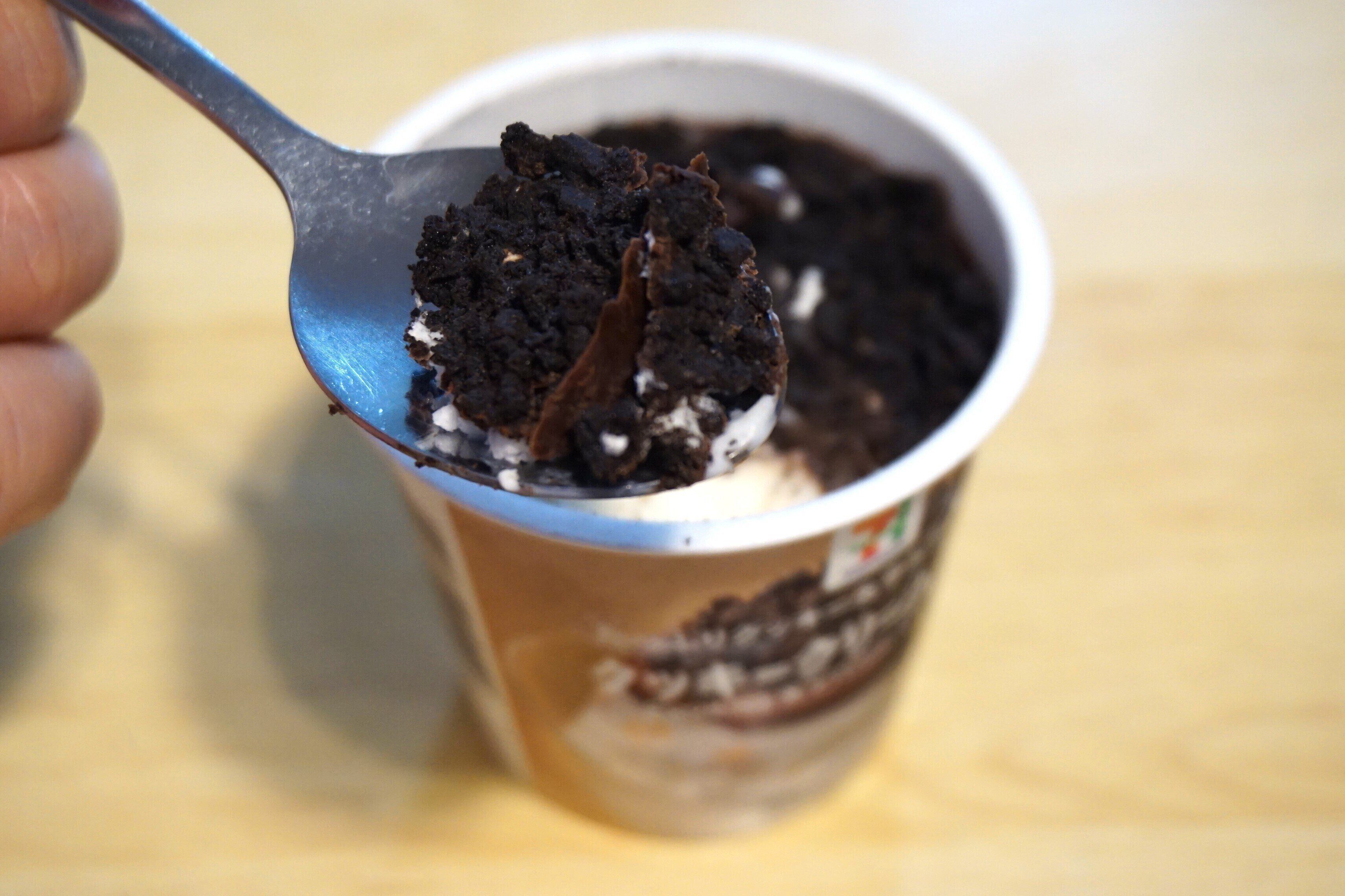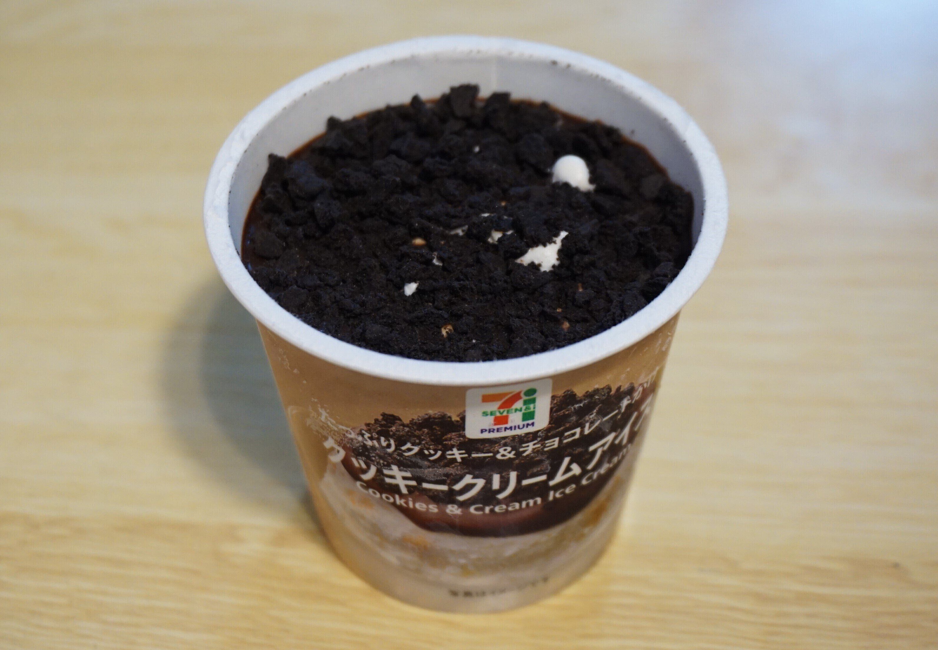 セブンイレブンのクッキークリームアイスは、上にたっぷりココアクッキーが トッピングされているのでフタを開けるときご注意ください。ゆっくり開けないとココアクッキーが飛び出してくるかもしれません。