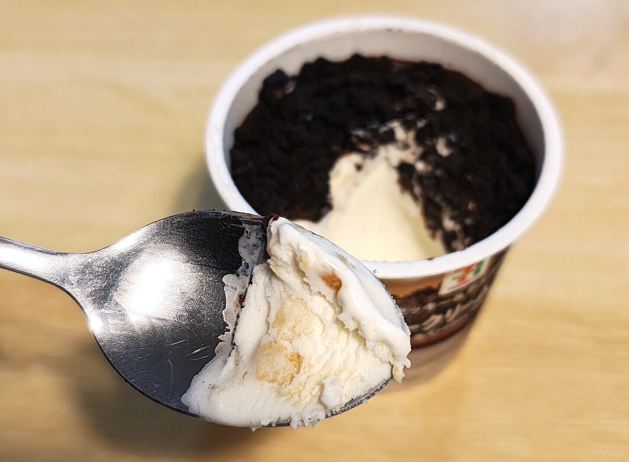 筆者の人生で食べたクッキー&クリームの中で一番おいしかったセブンイレブンの「たっぷりクッキー&チョコレートがけクッキークリームアイス」。サクサククッキーとしっとりクッキーのどちらも楽しめる、今までありそうでなかったクッキークリームアイスです。