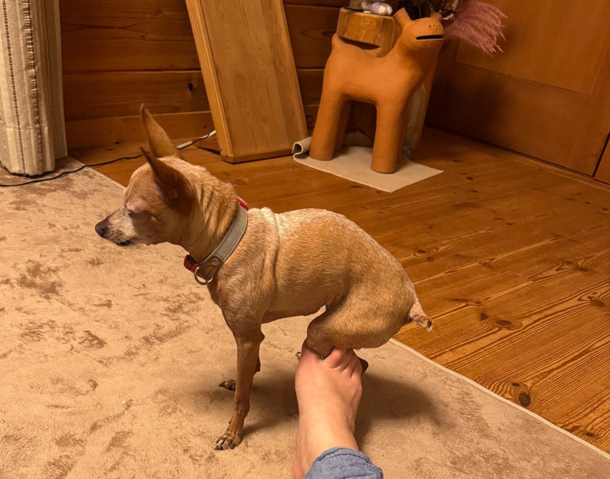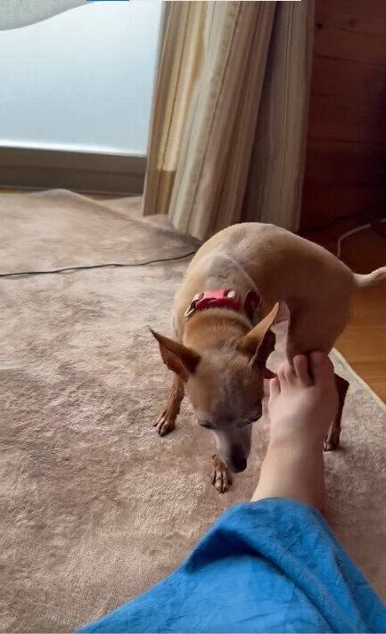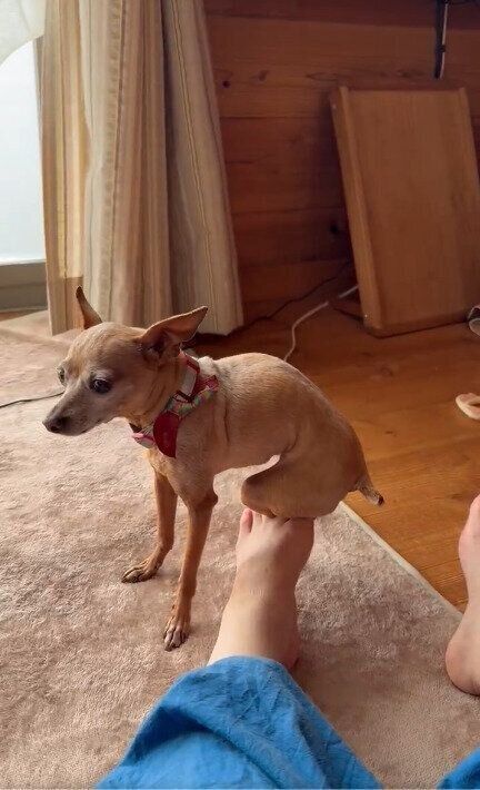 妹犬に抱っこの場所を取られてしまうと、飼い主さんの足の先に座ることもあるというひなちゃん。足の指先ほどの、ほんの少しの部分でもママさんと触れ合っていたい、というひなちゃんの思いが伝わってきますね。