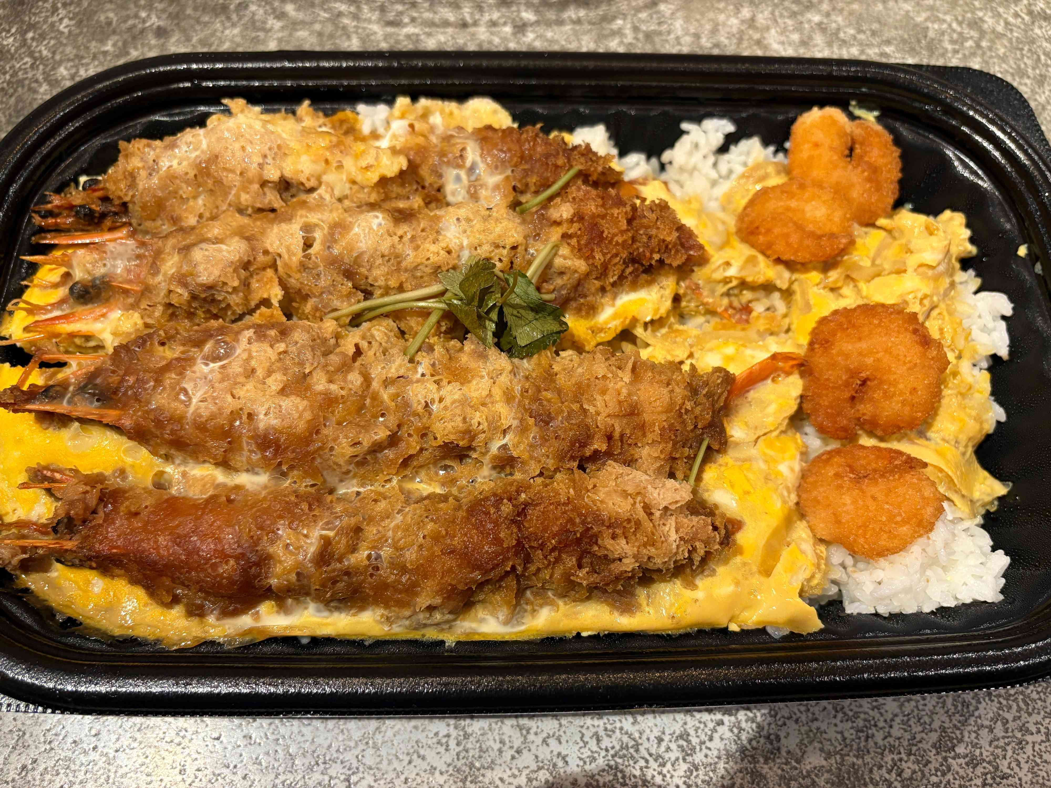 国産米を使用したご飯の上には、卵でとじた2種類の海老フライが贅沢に乗っています。有頭海老フライと頭と尻尾のない海老フライが、それぞれ4本ずつ入っています。一度で2種類の海老フライが食べられるのは、エビ好きにとってはたまりませんよね。