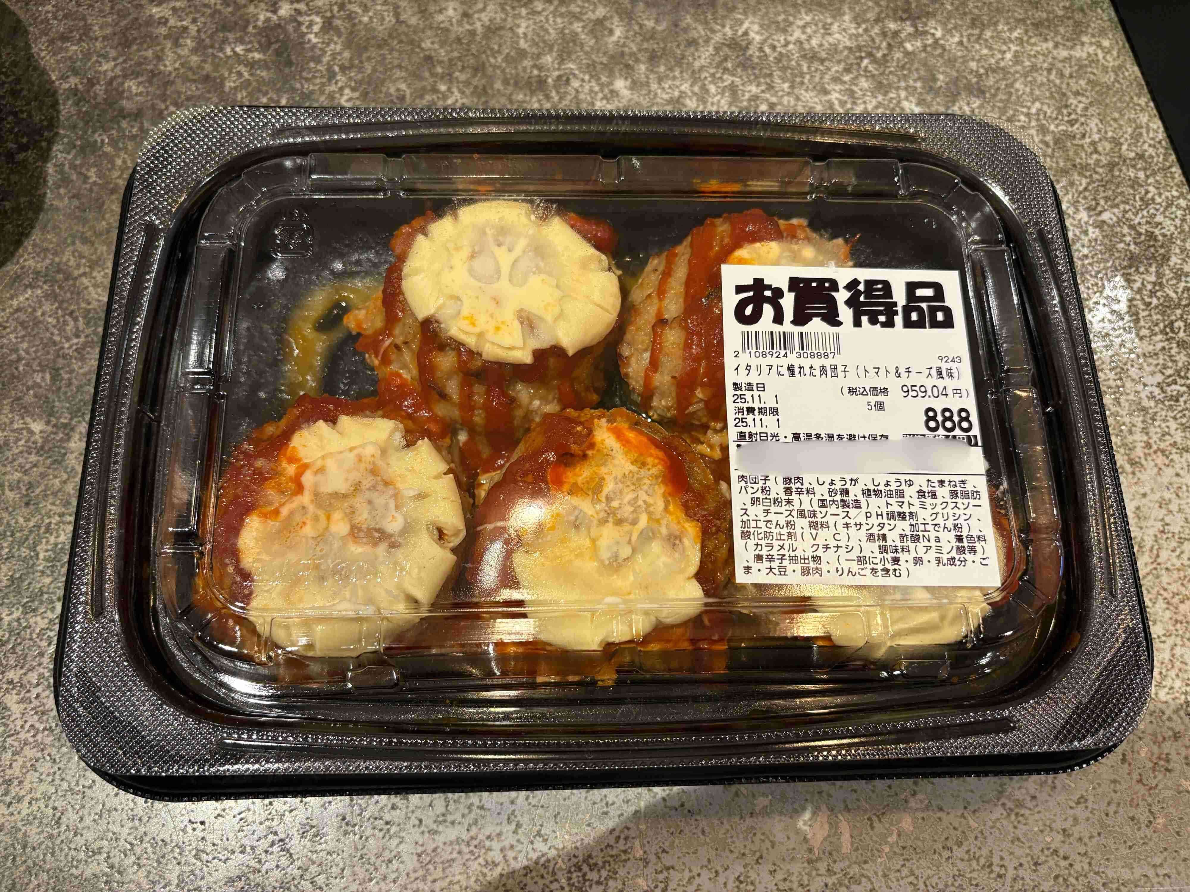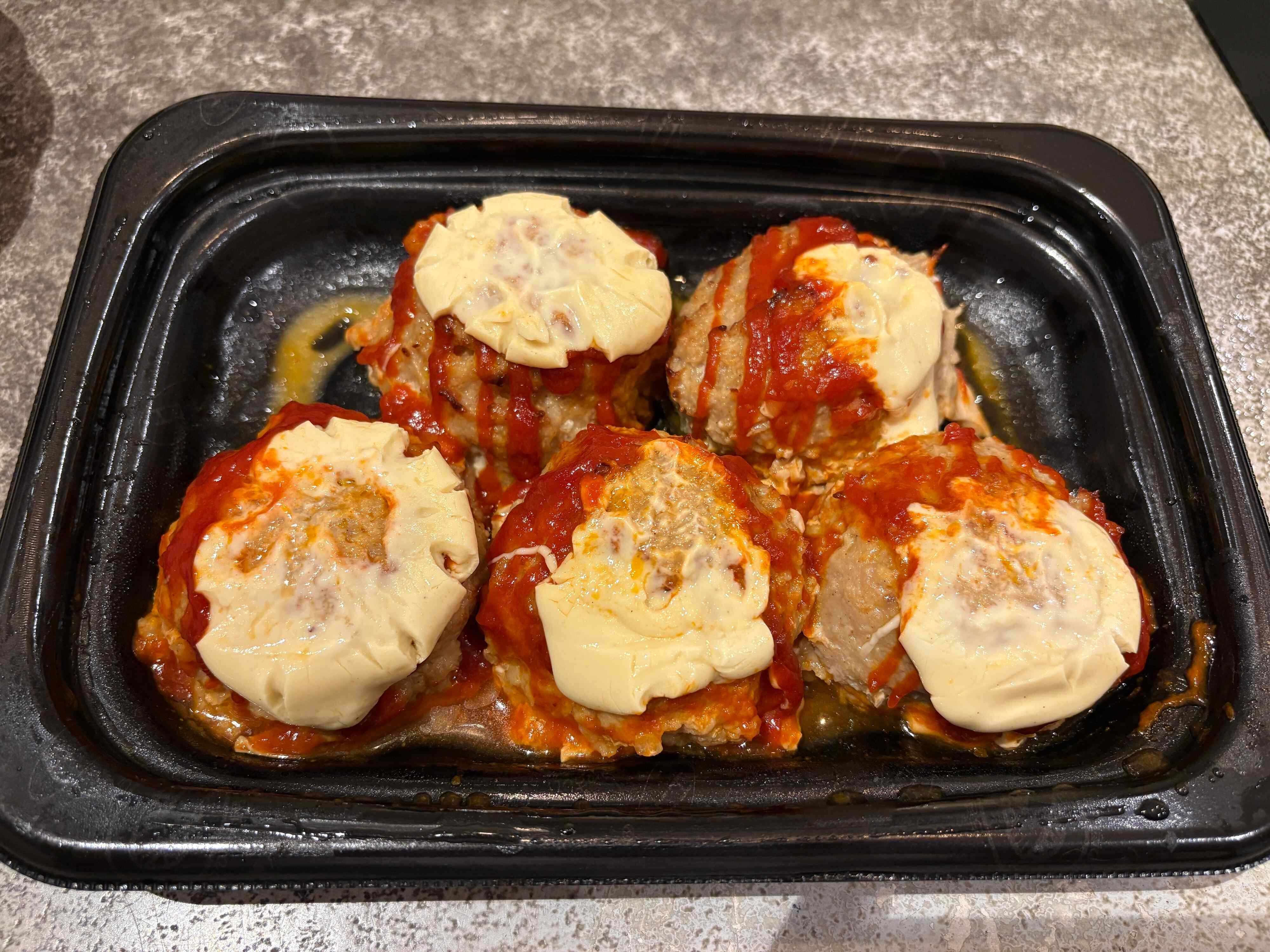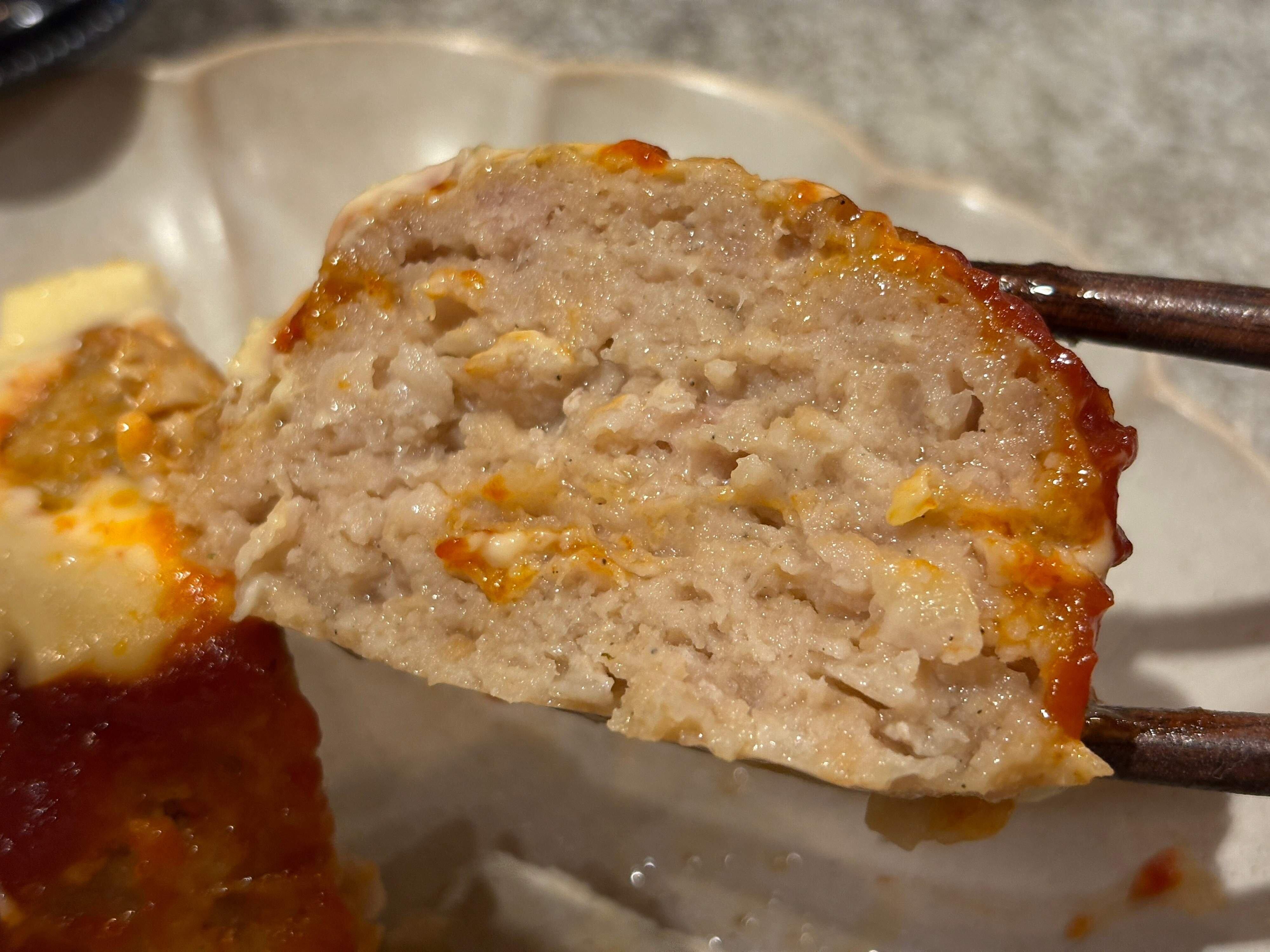 大きな肉団子の上に、トマトソースとチーズ風味ソースがたっぷり。「それはもう、ハンバーグなのでは?」と思いきや、ひと口食べてみると確かに肉団子なんです。