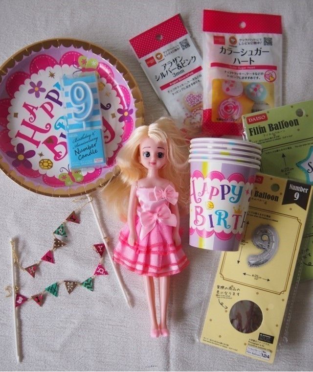 今回使うダイソーのアイテムは、ハッピーバースデーシリーズの紙コップ、紙皿、フラッグピック。フィルムバルーンシリーズのスマイル、ナンバー。着せ替えフレンズシリーズからエリーちゃん人形とパーティードレス。ケーキのデコに使うカラフルシュガー7、アラザンシルバー&ピンク、ナンバーキャンドル。すべて108円(税込)です。