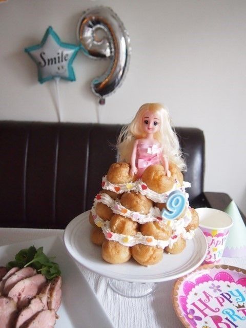 お人形の下半分にラップをくるくる巻いて、周りに市販のシュークリームを置いて生クリームやカラーシュガーでデコれば完成。インパクトのあるバースデーケーキは、子供から喜ばれること間違いなし!!