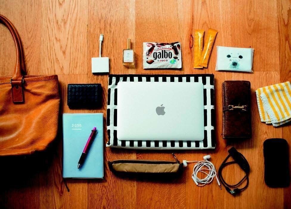 どこでも仕事ができるよう、バッグに必要なものを全部入れておく