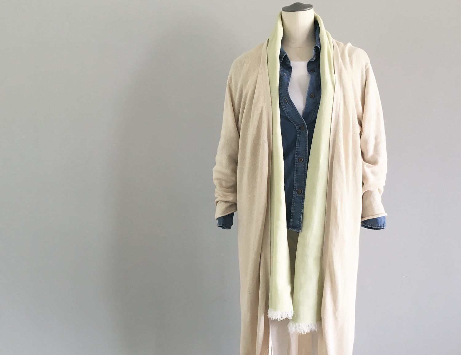 無印良品のストールはシンプルだから、どんな服装にも合わせやすい。しかも素材にこだわっています。新疆綿は綿の中でも高級なオーガニックコットン、毛足が長いから滑らかな手触りが特徴です。無地でよい素材のストールは、春夏に持っていると冷房・日除けにもぴったり!
