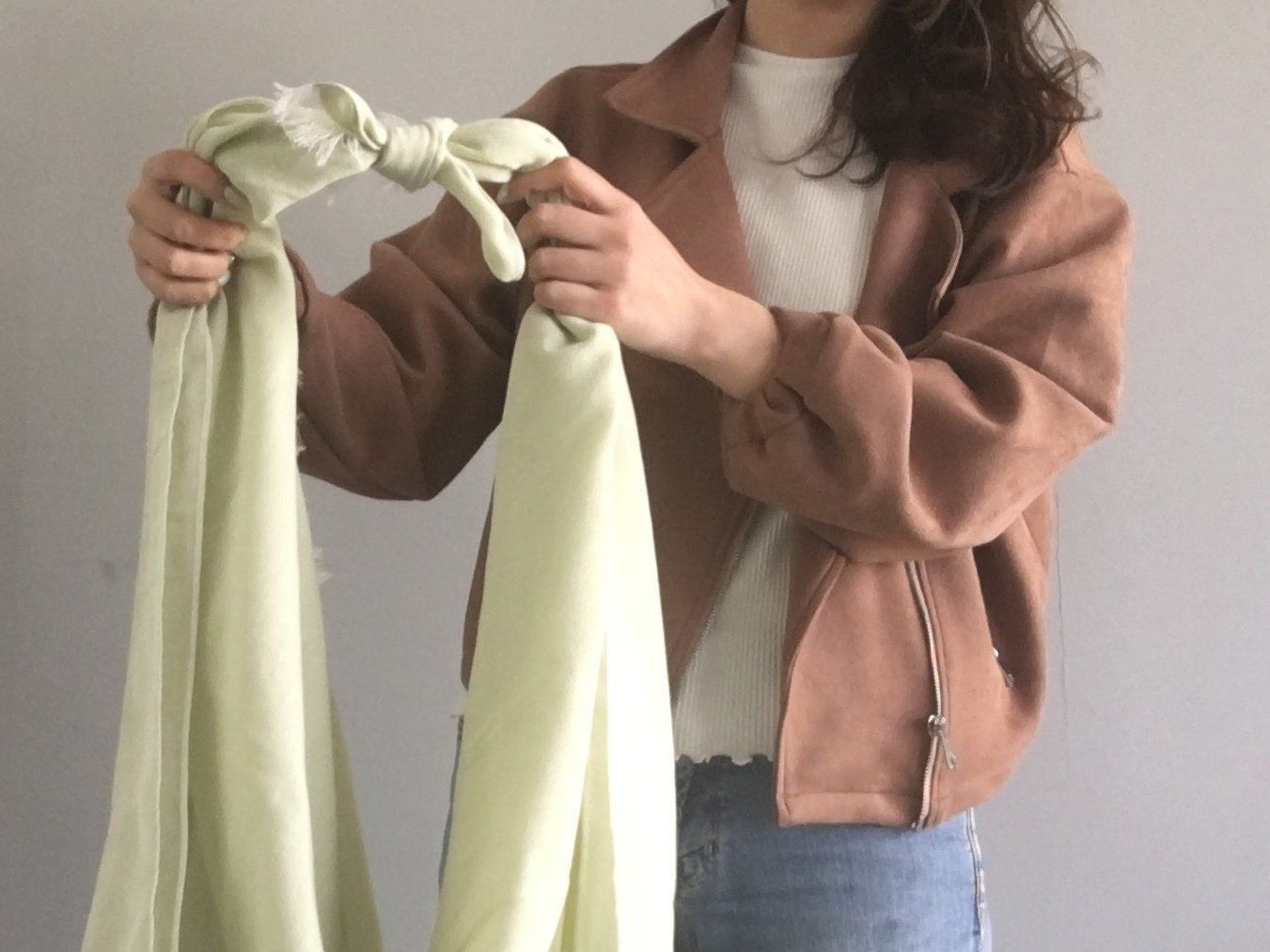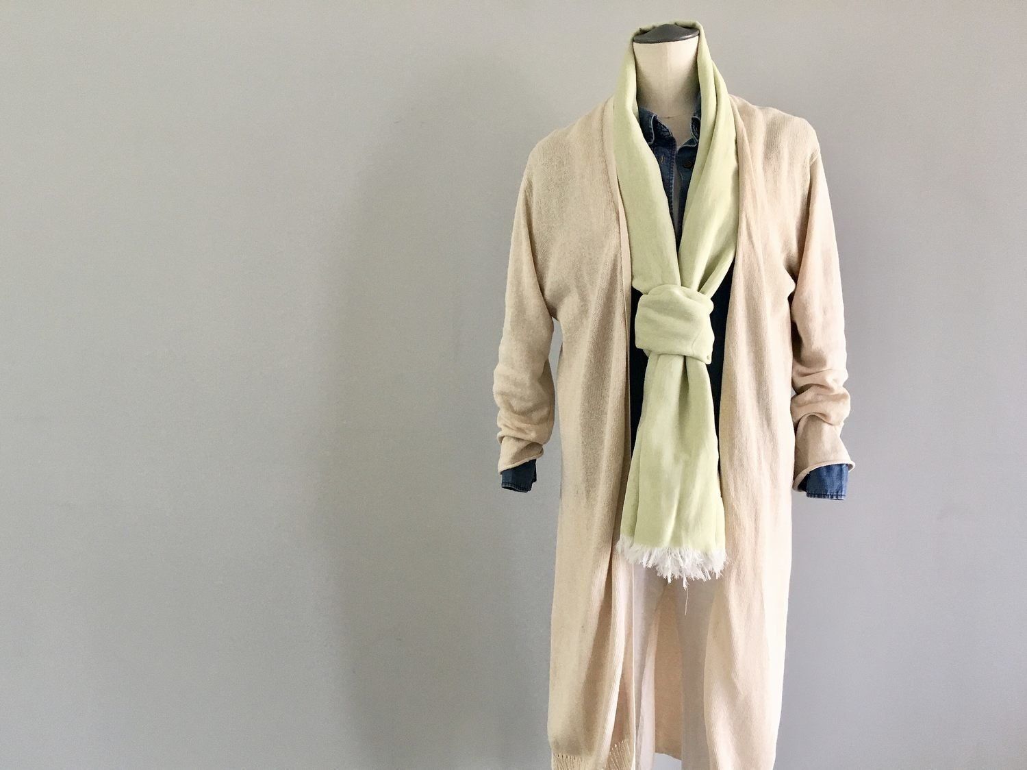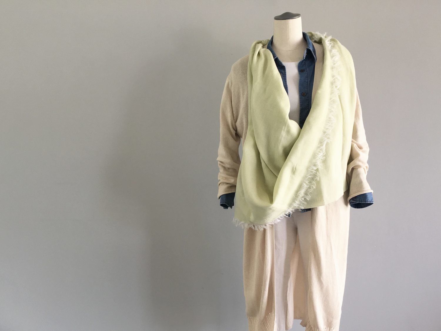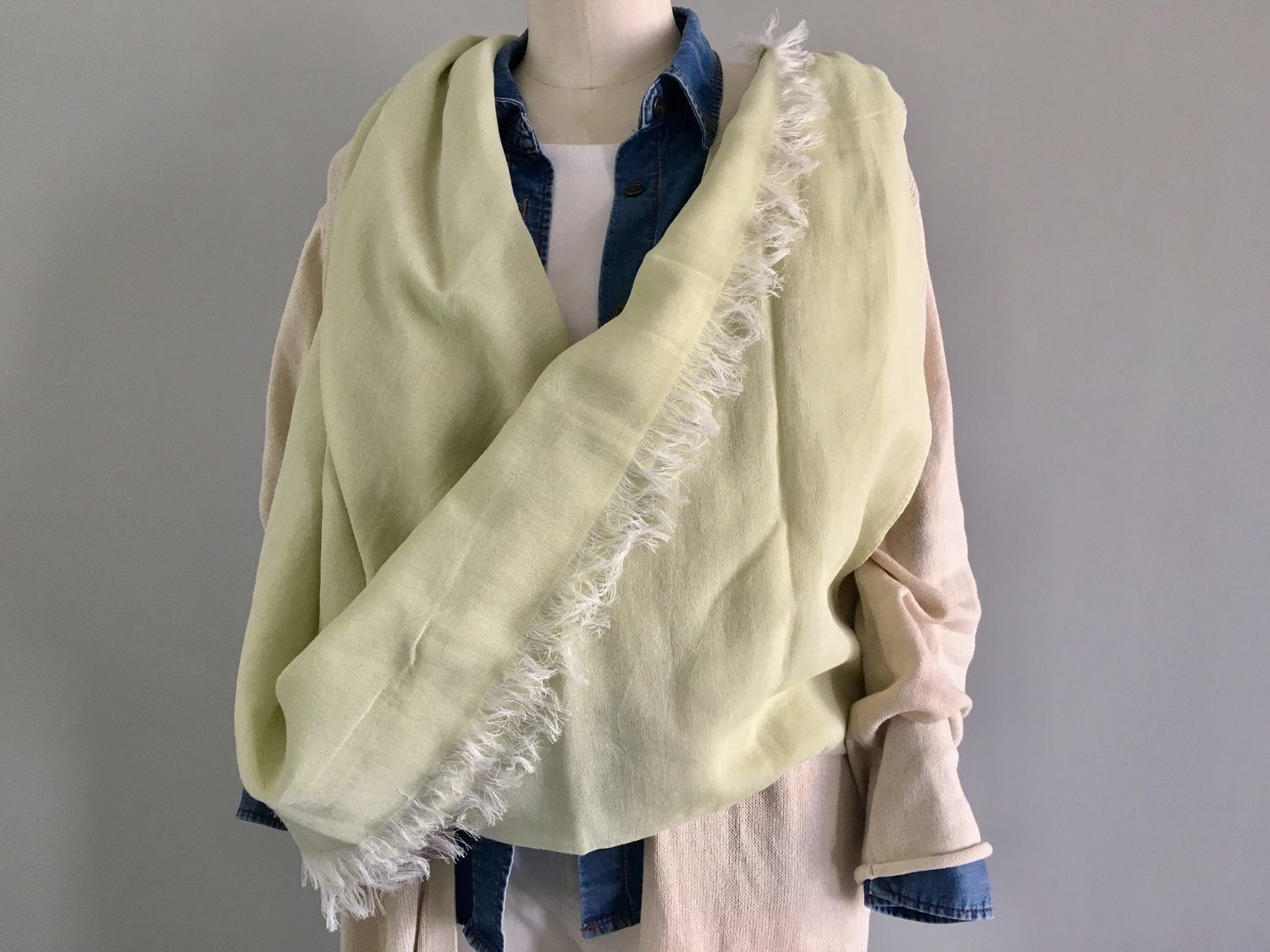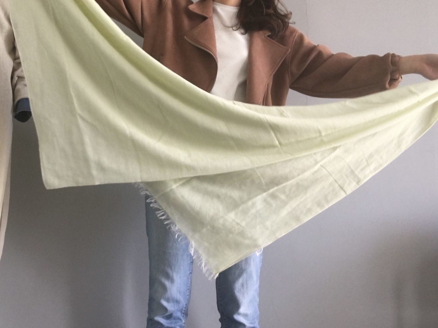「新疆綿 大判ストール」は複数のカラーが展開されていますが、春夏におすすめなのはライトグリーン!柔らかい風合いのストールにぴったりの薄いグリーンです。サイズは190×130cmと大判ですが、とても薄手で重たい印象はありません。