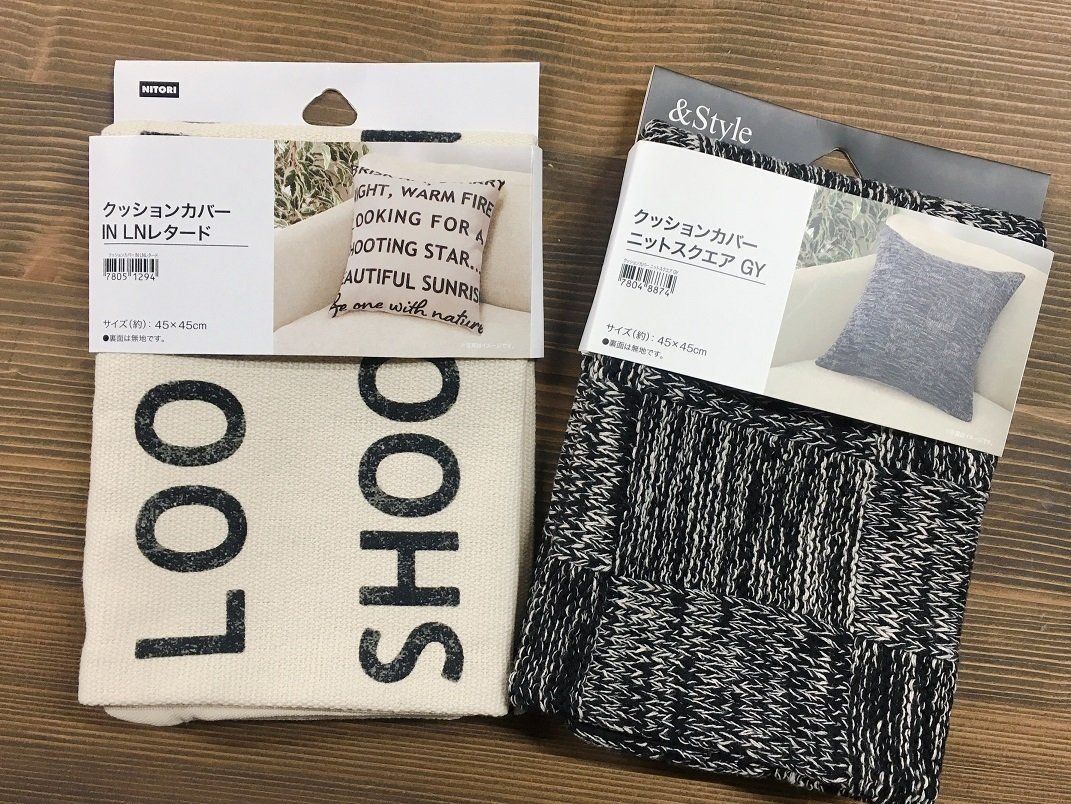 種類豊富なニトリのクッションカバー。今回はその中から、秋らしく落ち着いたモノトーン系「クッションカバー IN NLレタード」(740円)と「クッションカバー ニットスクエア GY」(832円)の2つを選びました。