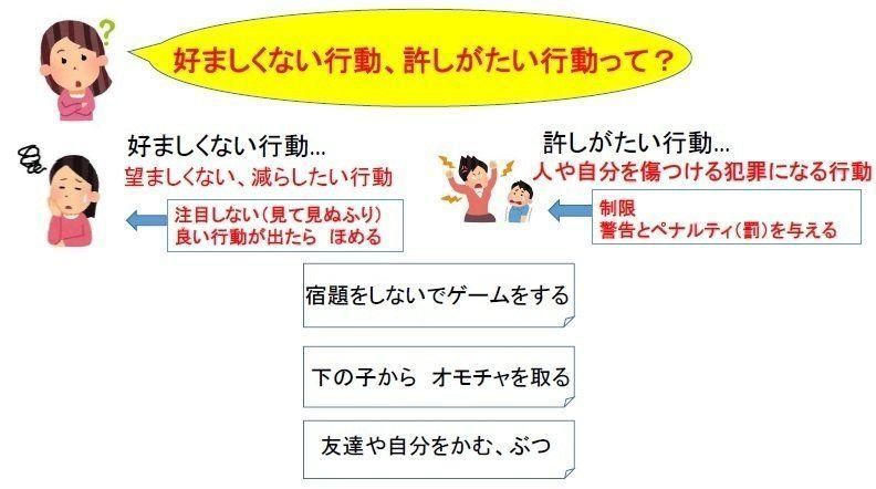 「親にとっての好ましくない行動」と考えるとイライラしますが、「子どもの成長にとって好ましくない行動」と考えたら、子どものためにも行動を減らしていくことが大事!と思えますよね。