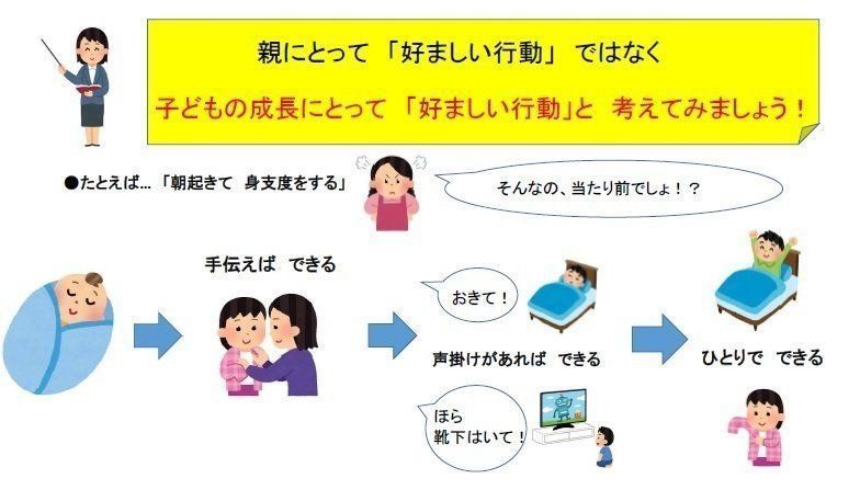 では、こう考えてみましょう。生まれたての赤ちゃんのときは、何もできず、寝たいときに寝ていましたね。それが、少しずつ、手伝えばできることが増えていきます。そのうち、声をかければできるようになり……最終的には一人の力で起きて身支度できるようになります。