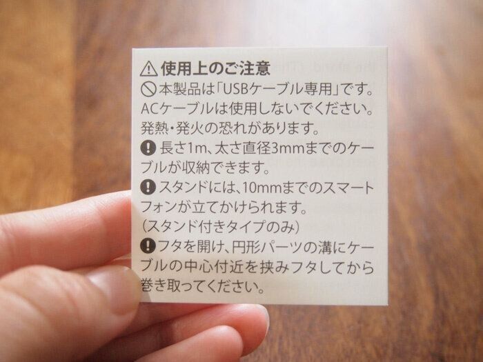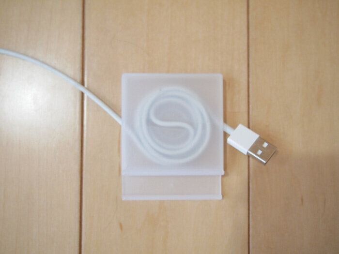 このような感じでからまらずきれいにケーブルが収まります。ケーブルを持ち運ぶ機会の多いかたにはまさにうってつけと言えましょう。スタンドのついていないタイプも同じ190円(税込)なので、スタンドつきはお得だな…!と思いました。
