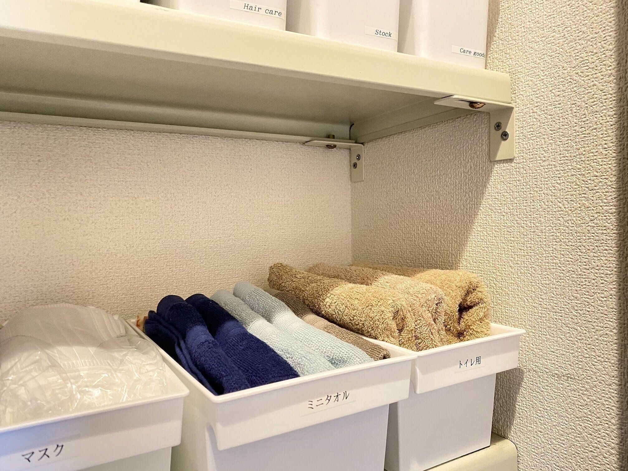 収納棚に16cmセンチ幅の収納ボックスでタオルを3つ折りに畳んで入れてみたところ6枚が入りました。畳み方と入れ方次第では、あと数枚は入りますので家族が多い方もこれなら管理はしやすいですね。