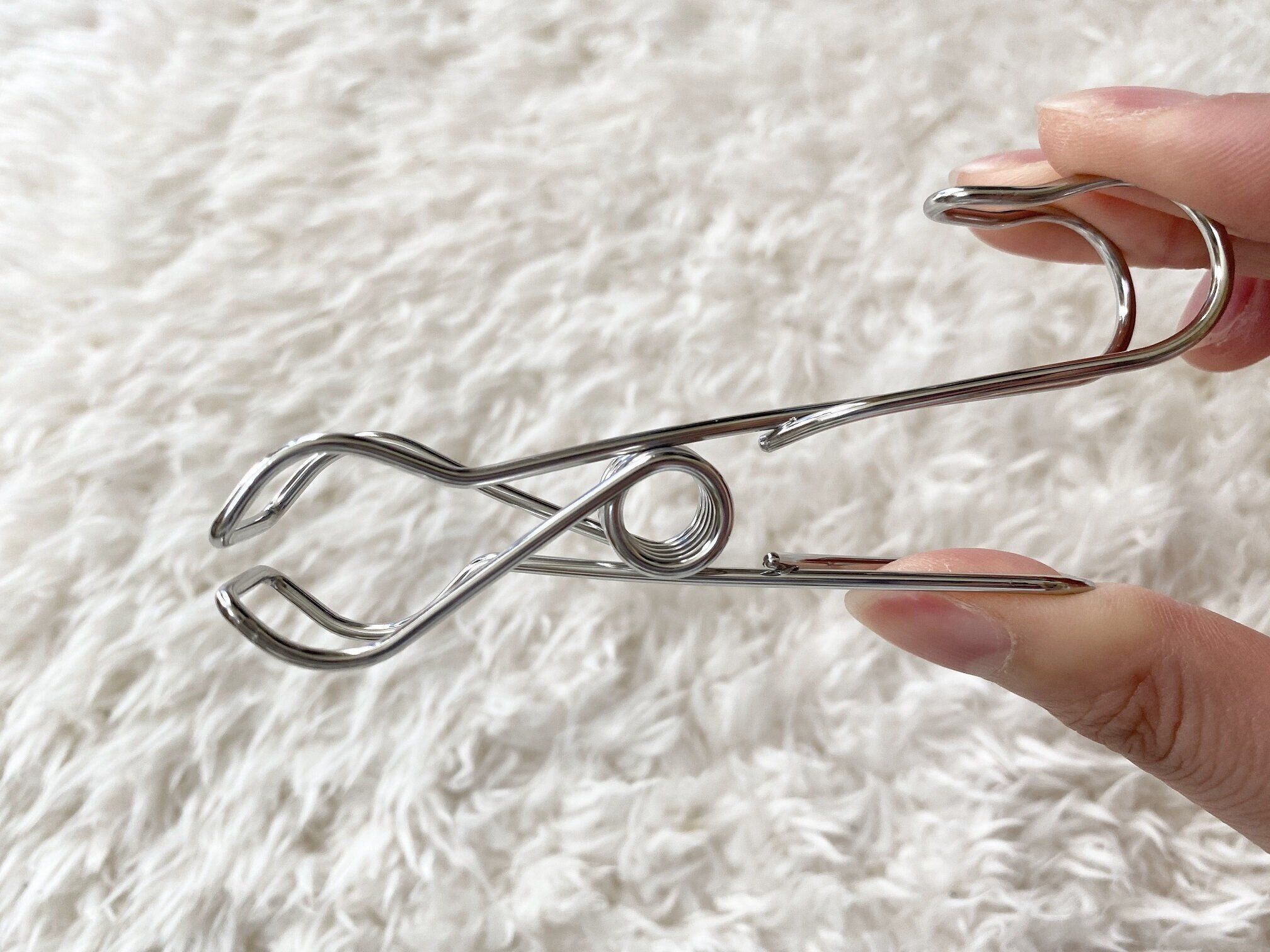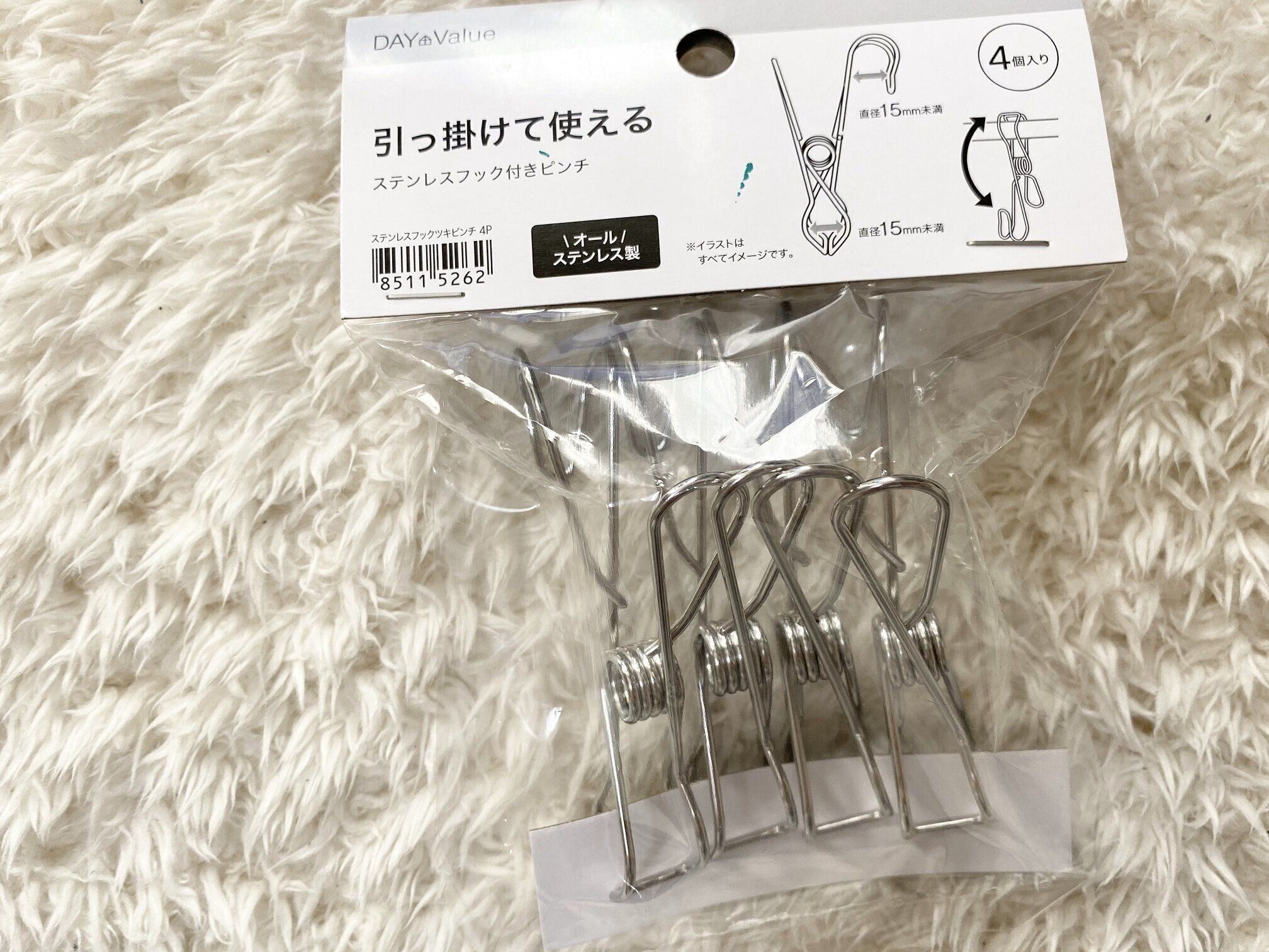 「ウォッシュタオル」と合わせて使いたいのが、つぎに紹介するニトリの「ステンレスフック付きピンチ」です。4個入りで価格は299円。