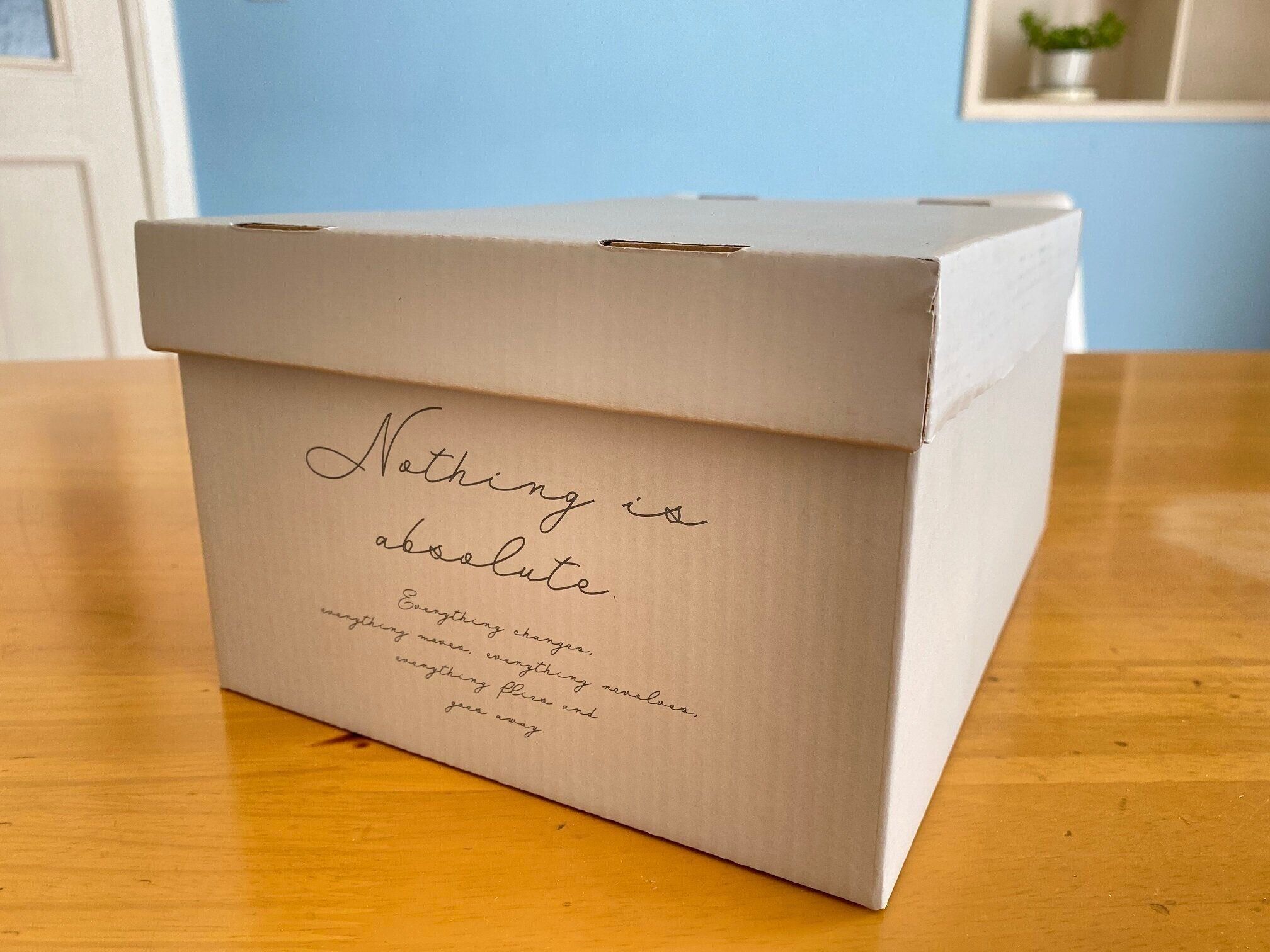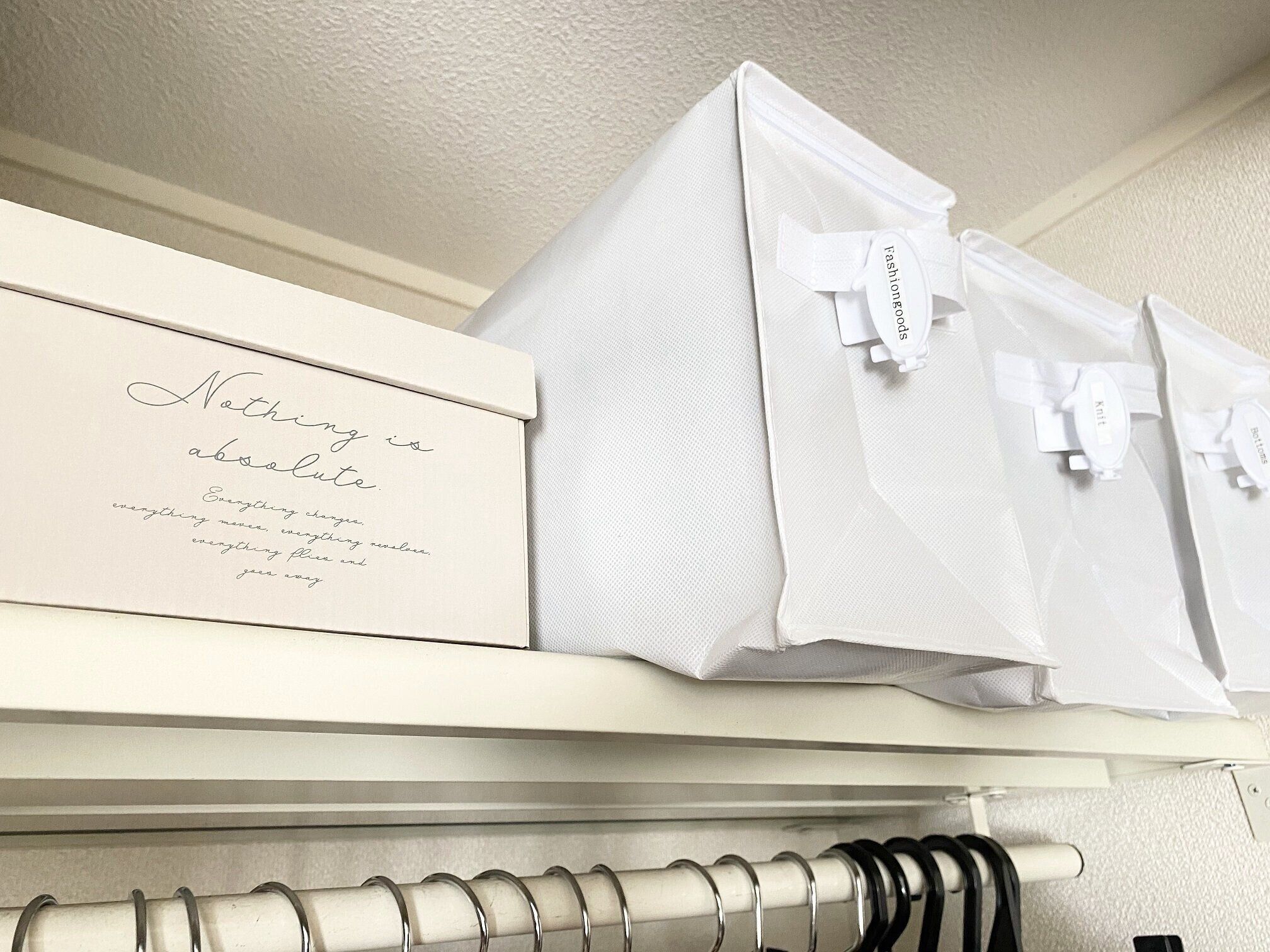クローゼット収納に箱を使うのもおすすめ。靴箱みたいなロゴがかわいい写真の箱は、キャンドゥの「ペーパーボックス」。価格は110円で、サイズは高さ12.5×横19×奥行き26cmです。