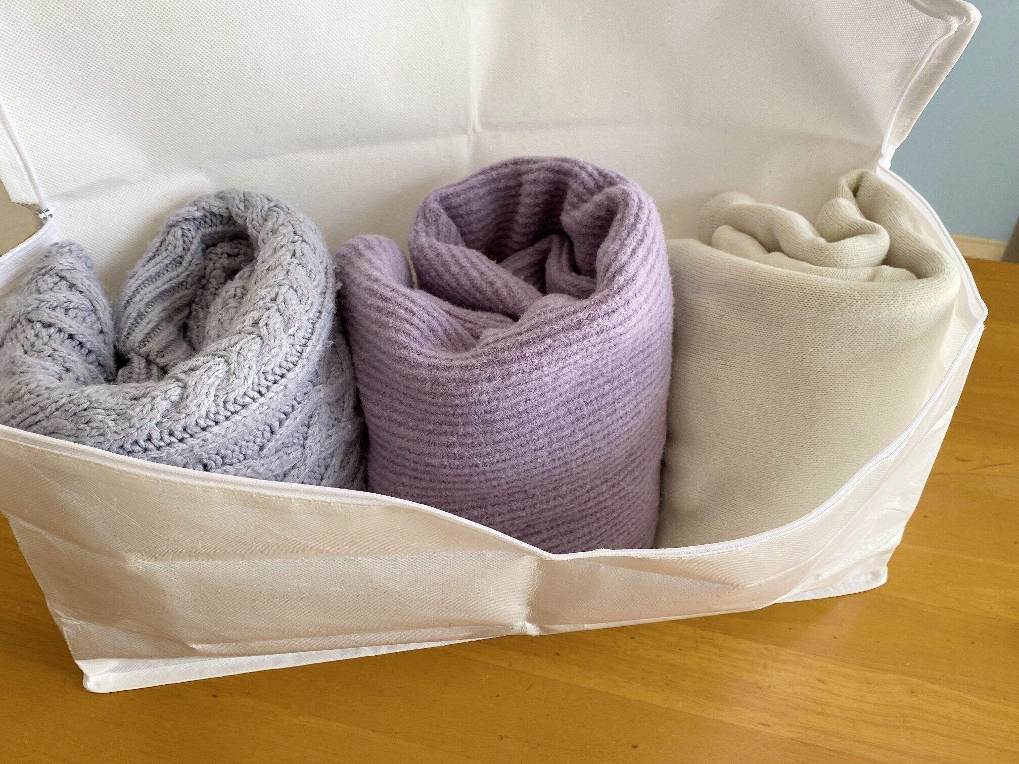 サイズは縦25×横15×奥行50cm。写真のとおり厚手のニットなら約3枚が入ります。ボトムは約5本が畳んだ状態で入りました。