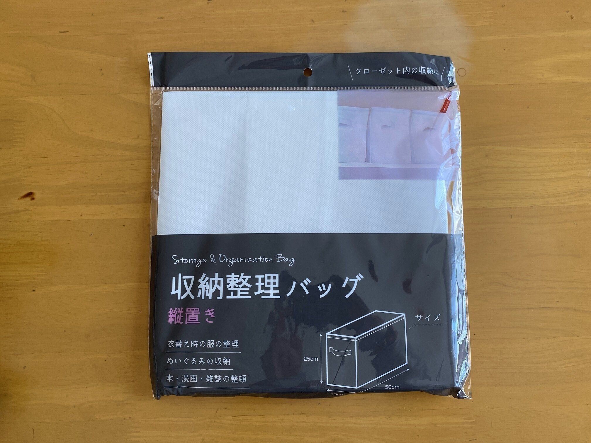 シーズンオフの服の管理やお子さまのサイズアウトなど、今はあまり使わないというモノは収納バッグで管理しましょう。今回使ったのは、キャンドゥで購入した「収納整理バッグ 縦置き」。価格は110円です。