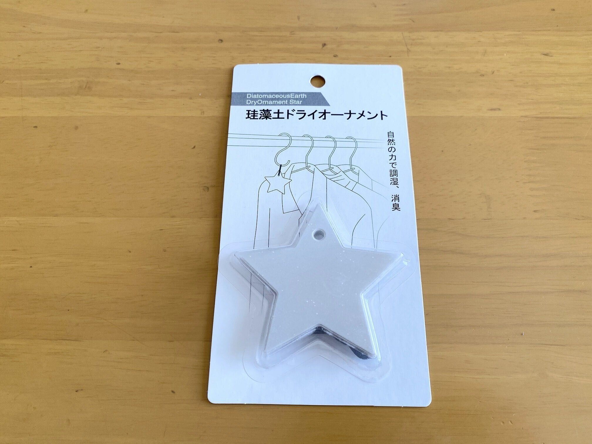 星形がかわいい「珪藻土ドライオーナメント」(価格110円)は、付属の紐をつけたらハンガーやS字フックでかけてクローゼットや押し入れ、タンス内での調湿効果が!1、2週間ごとに晴天の日のお洗濯時に干しておけば長く使えるアイテムでおすすめです。