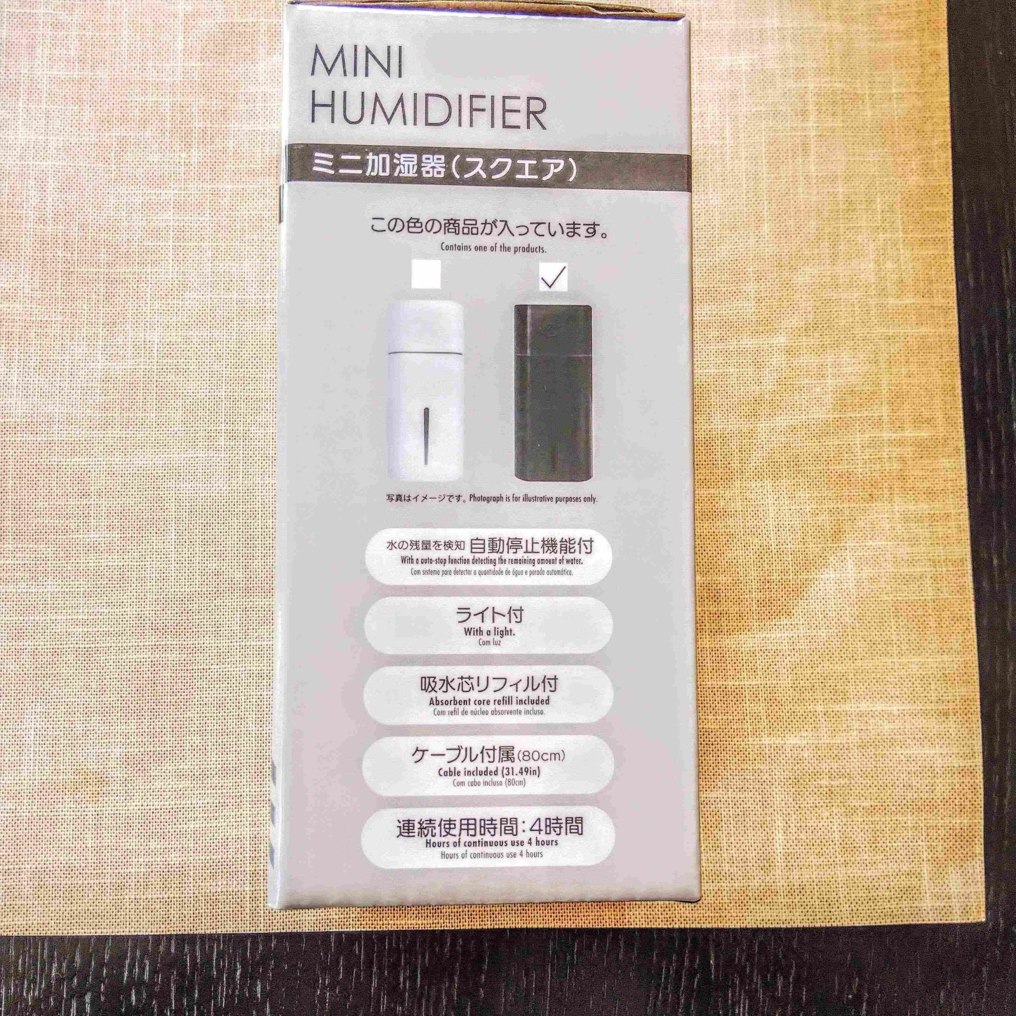 こちらがワンコインで購入できるミニ加湿器です。カラーはホワイトとブラックの2色ありました。残念ながら売り場にはブラックしかなかったのでこちらを購入。