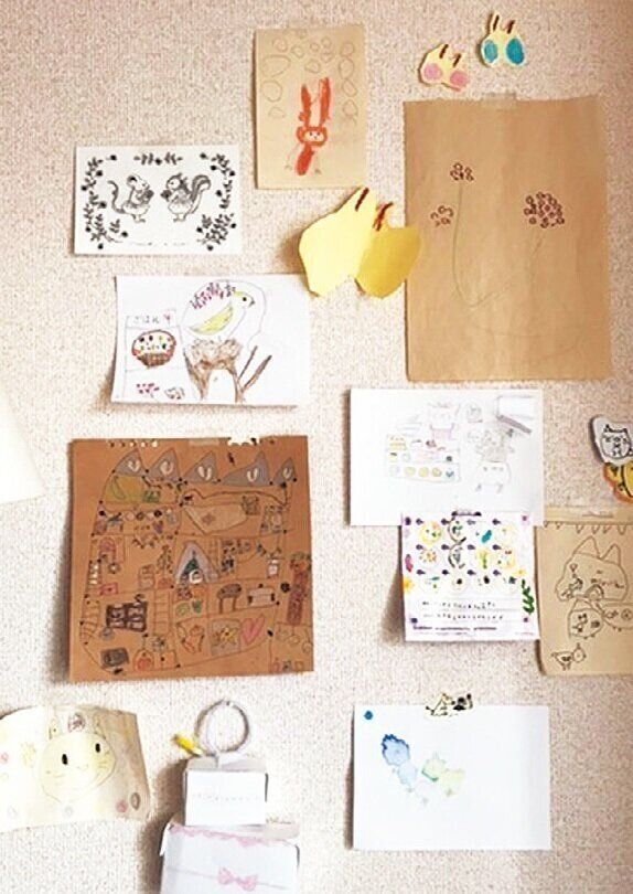 子どもが描いたちょっとした絵は、飾るスペースを集中させて。縦横のラインを所々そろえて飾るとすっきり見えます!