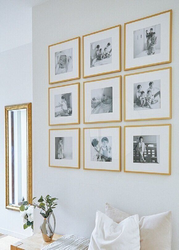 高級感のあるゴールドのフレームは、イケアで購入。等間隔で並べると美しい。写真は雰囲気が出るモノクロプリントに。