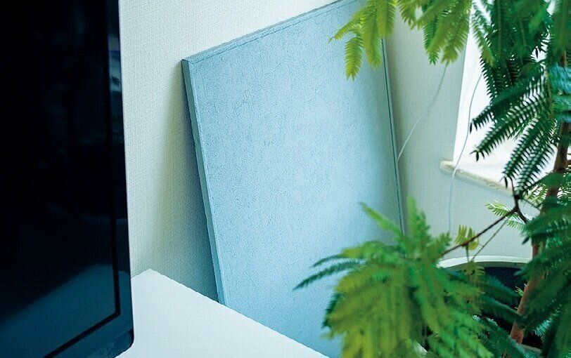 手持ちのポスターフレームに、グレーの漆喰ベースを塗って作製したパネル。コンセントの前に立て掛ければ、生活感ゼロに。